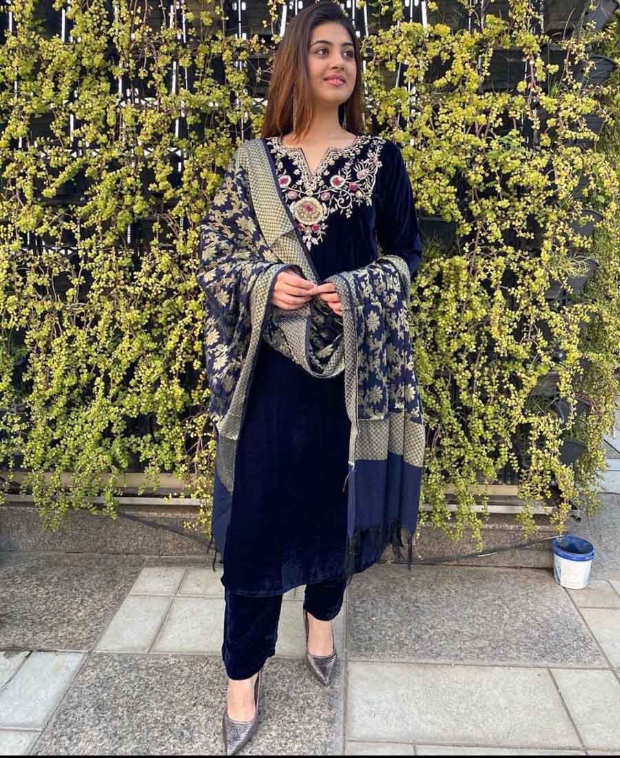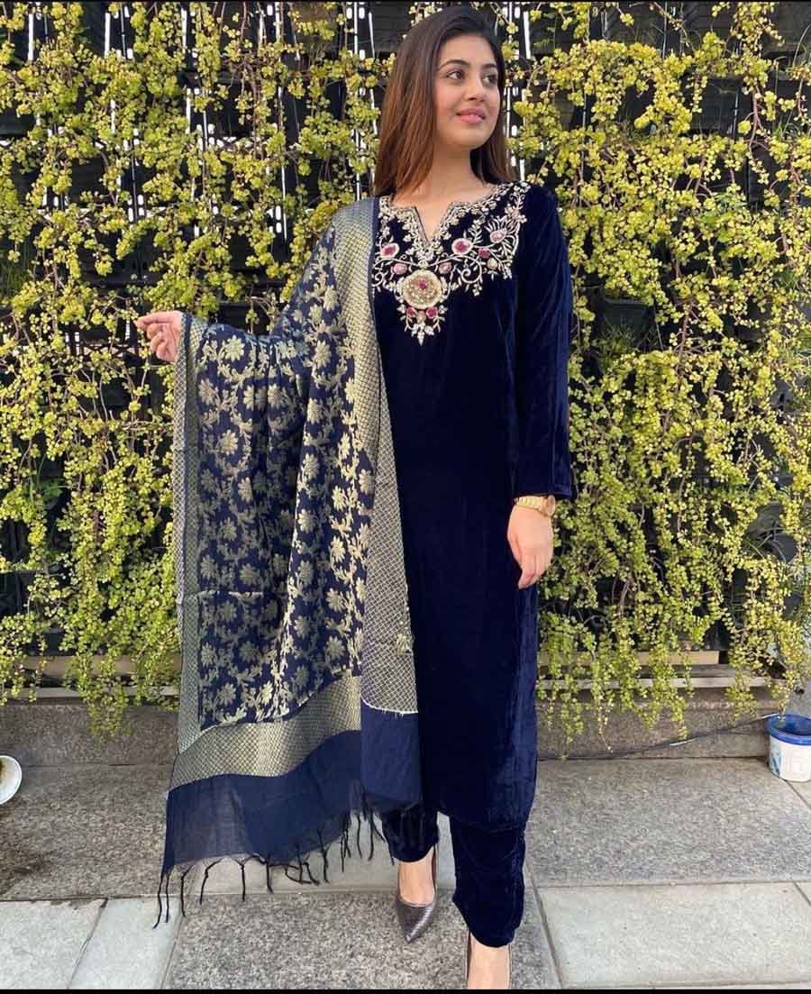 ATTRACTIVE VELVET EMBROIDERY WORK TOP BOTTOM WITH DUPATTA NAVY BLUE