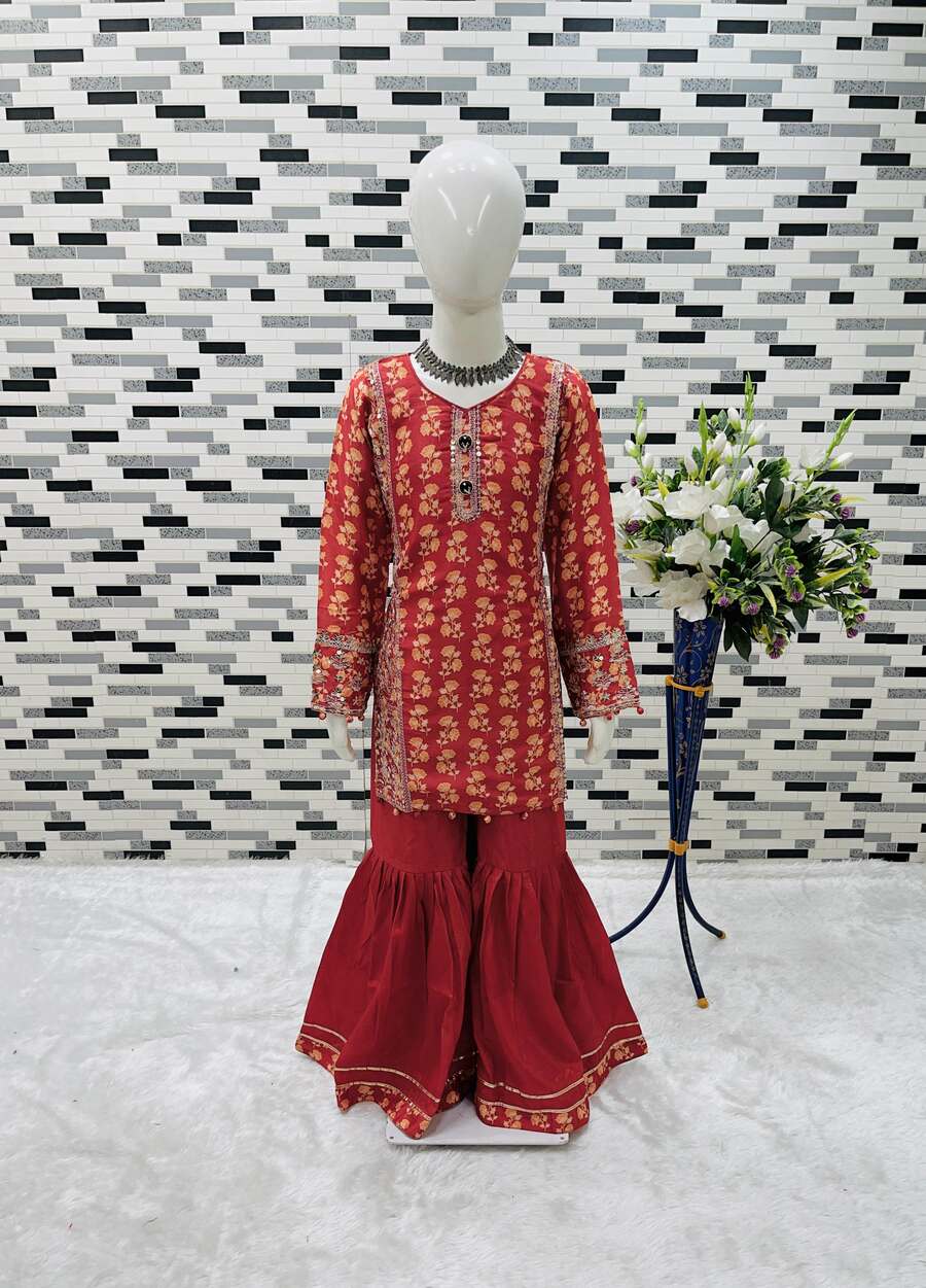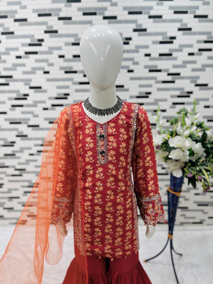 ESIGNER CHINON EMBROIDERY SEQUENCE WORK KID’S TOP SHARARA WITH DUPATTA ORANGE