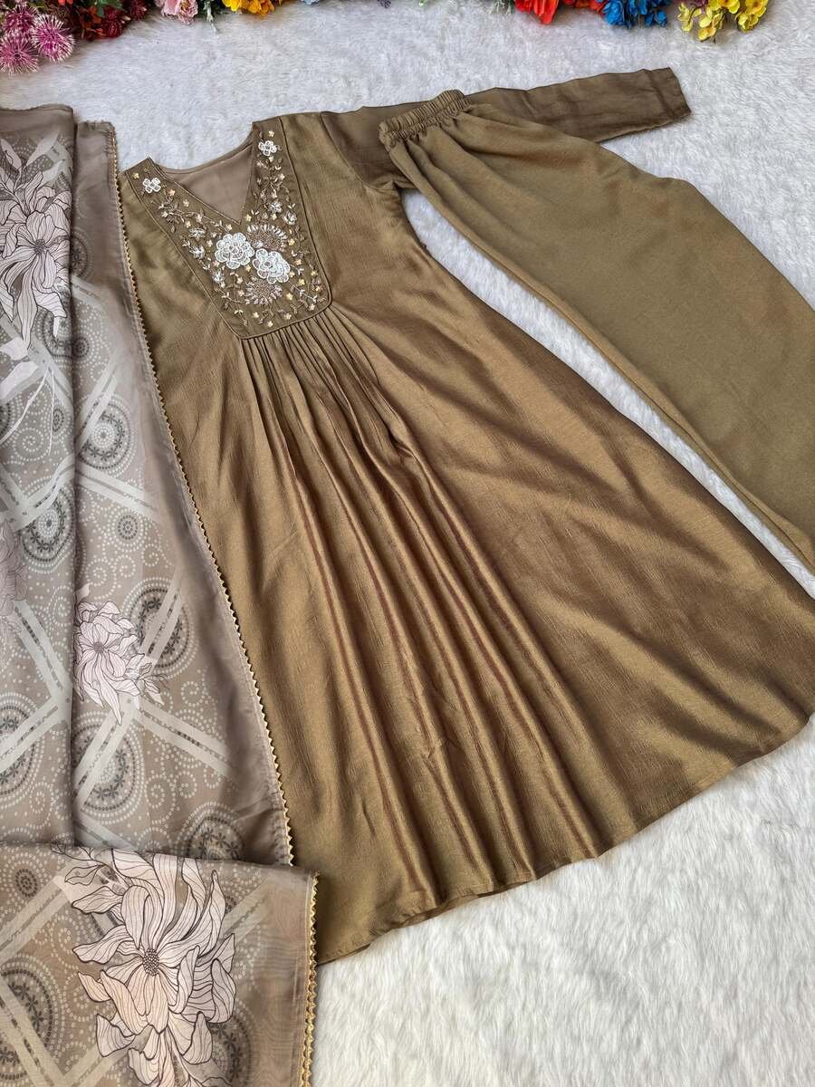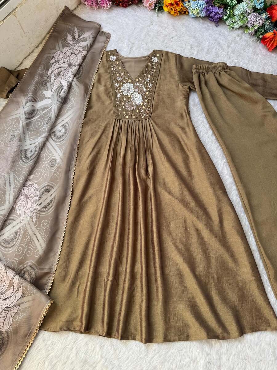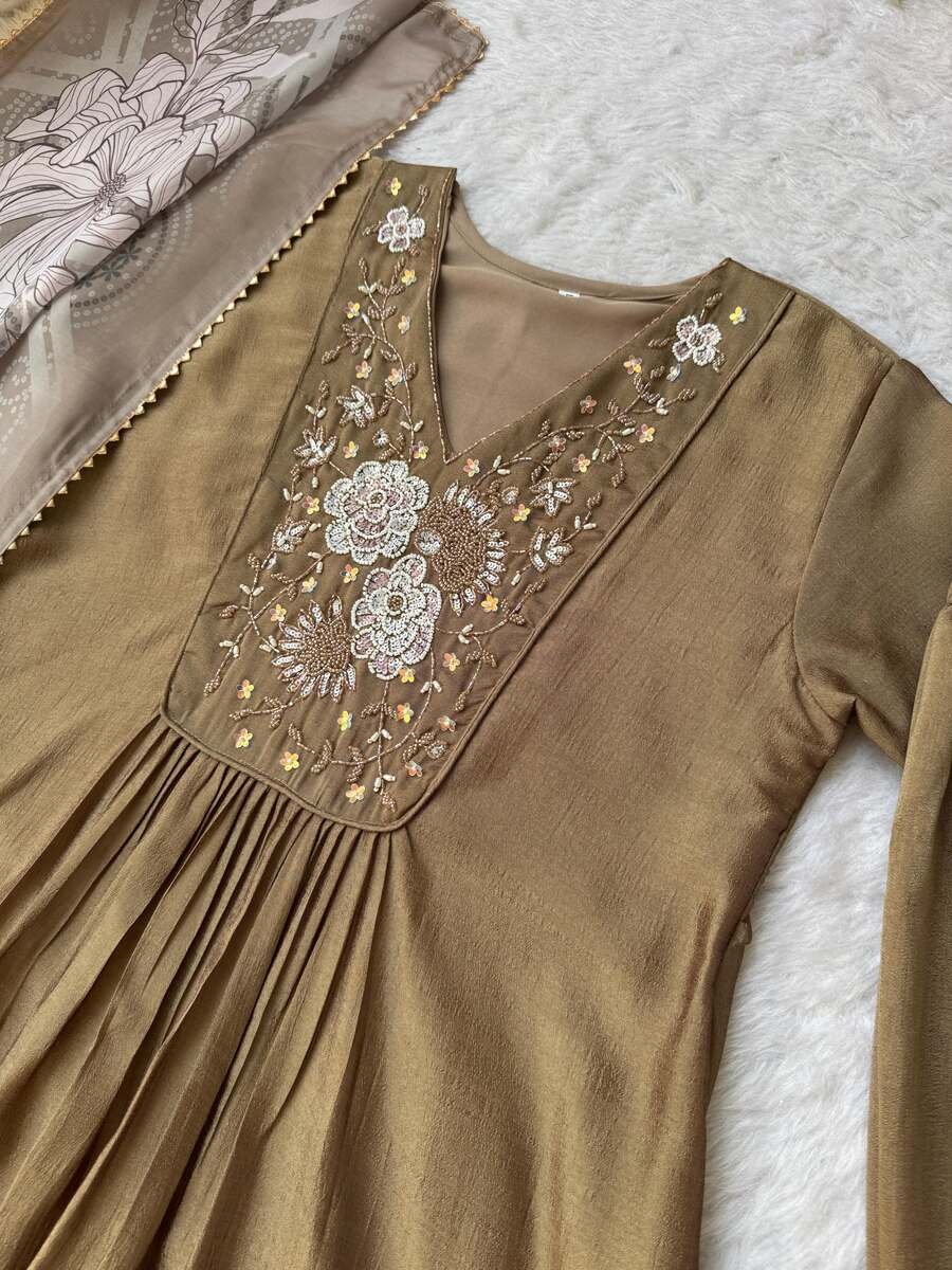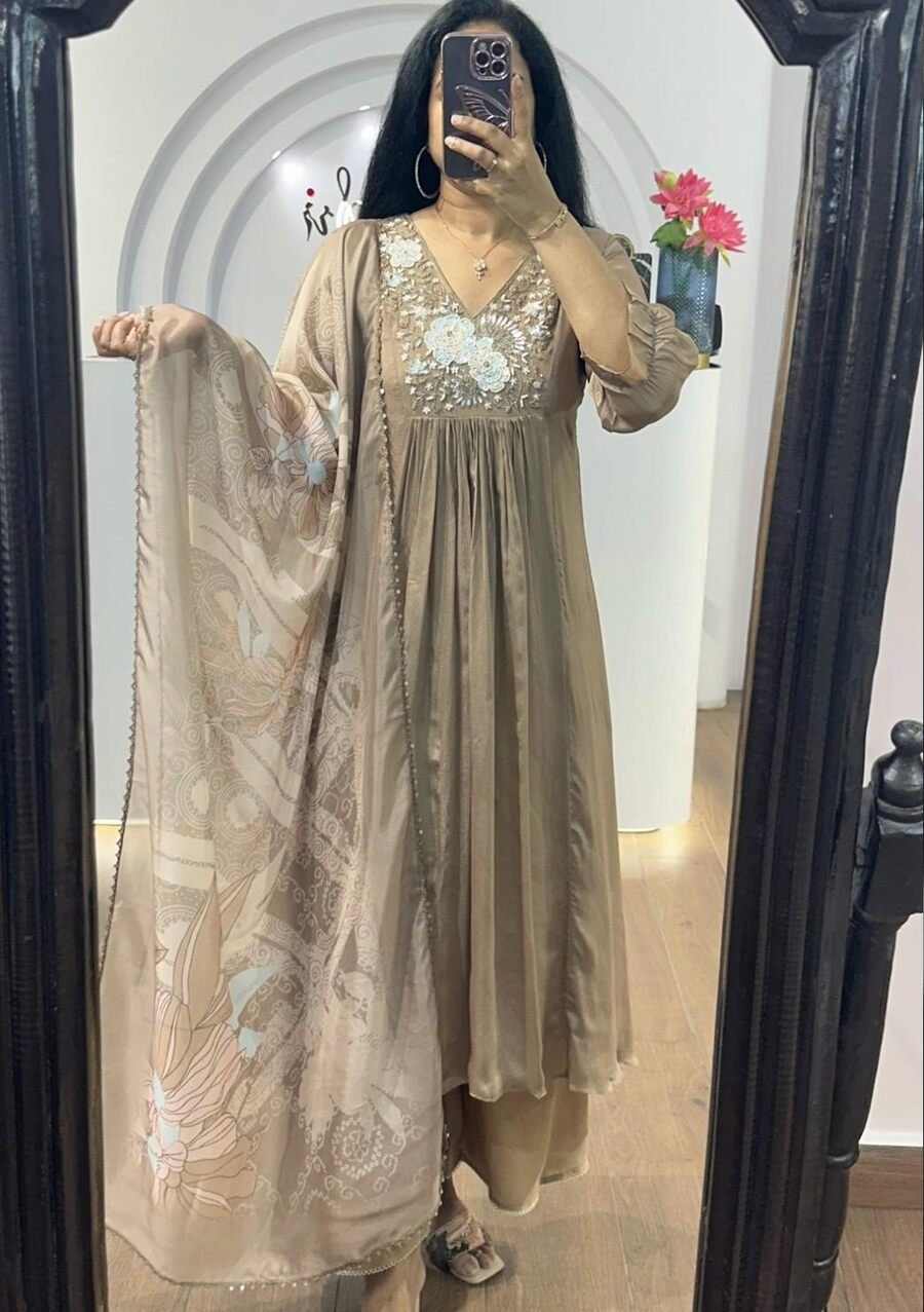 FABCY VICHITRA SILK HAND WORK A LINE GOWN PALAZZO WITH DUPATTA CHIKU