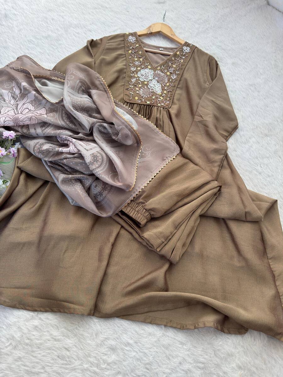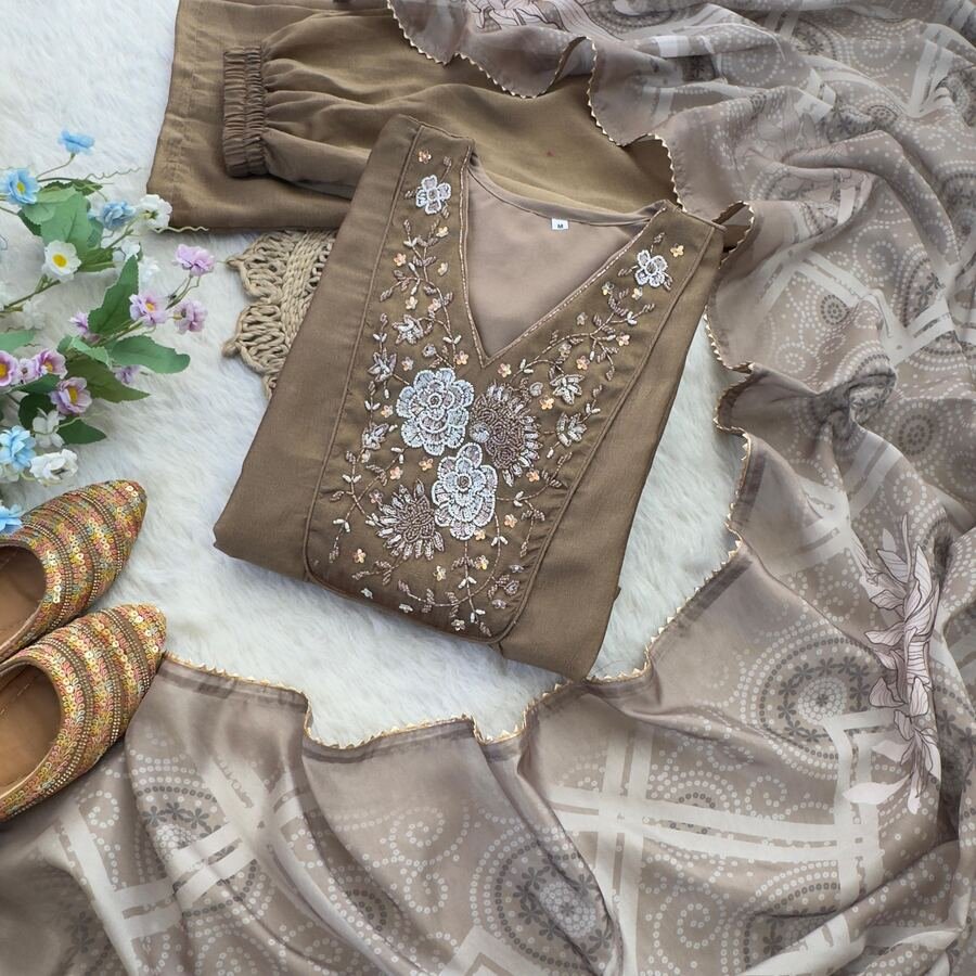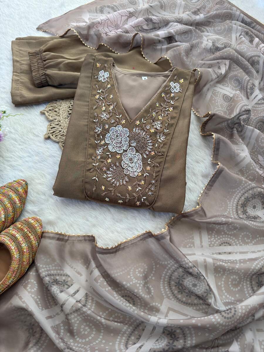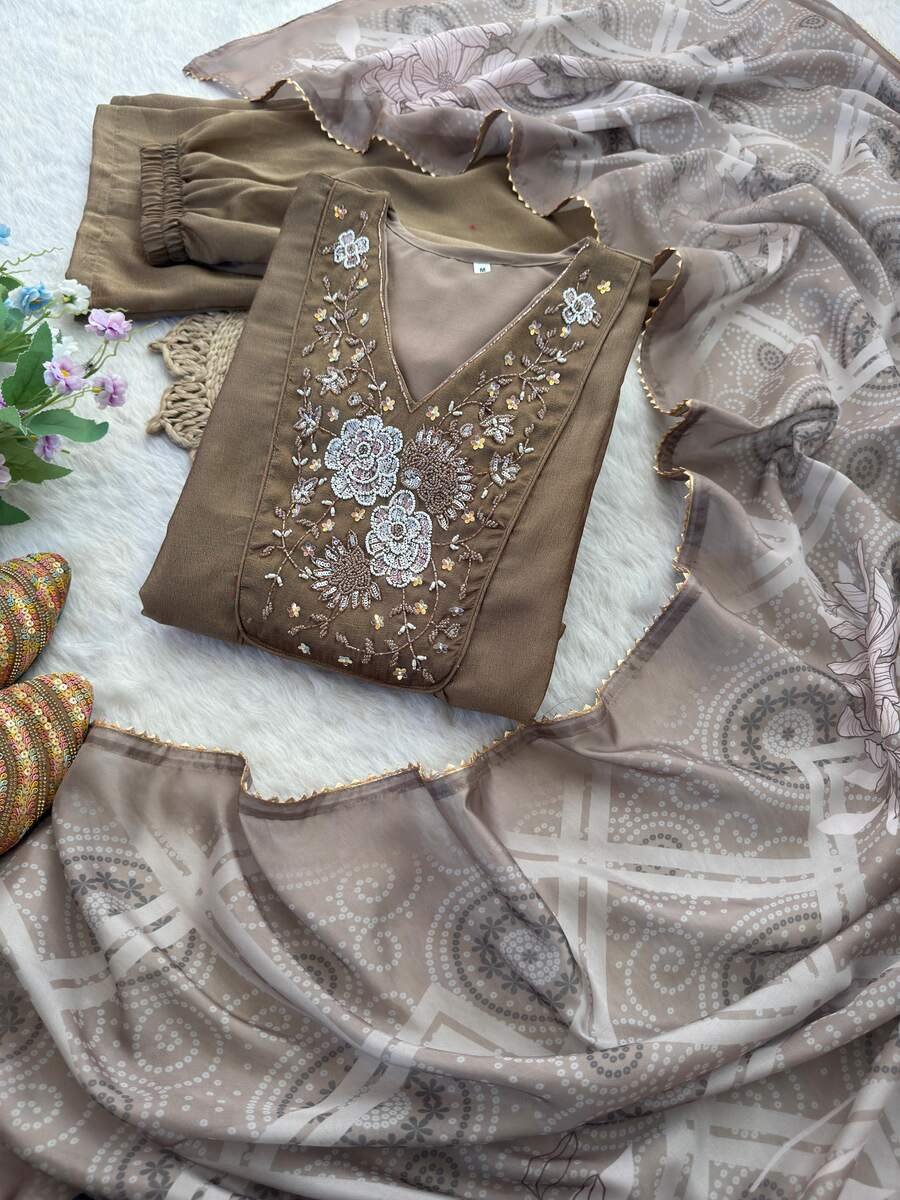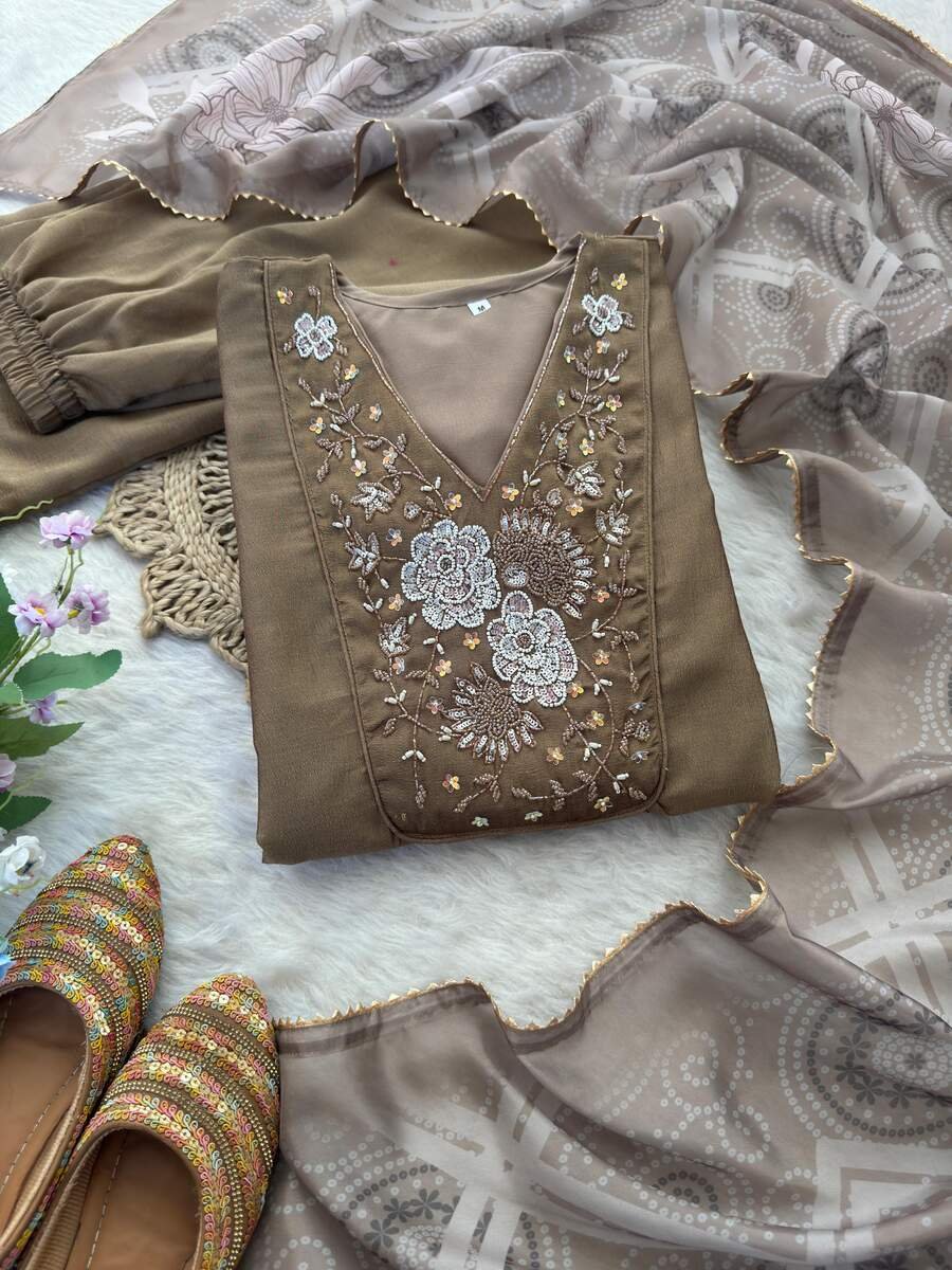 FABCY VICHITRA SILK HAND WORK A LINE GOWN PALAZZO WITH DUPATTA CHIKU