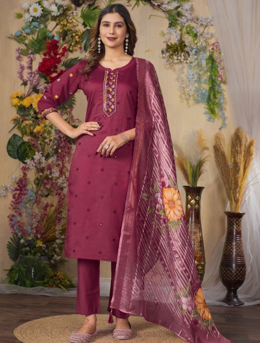 FABULOUS VISCOSE ROMAN SILK MULTI EMBROIDERY THREAD, WITH HAND WORK TOP BOTTOM WITH DUPATTA WINE