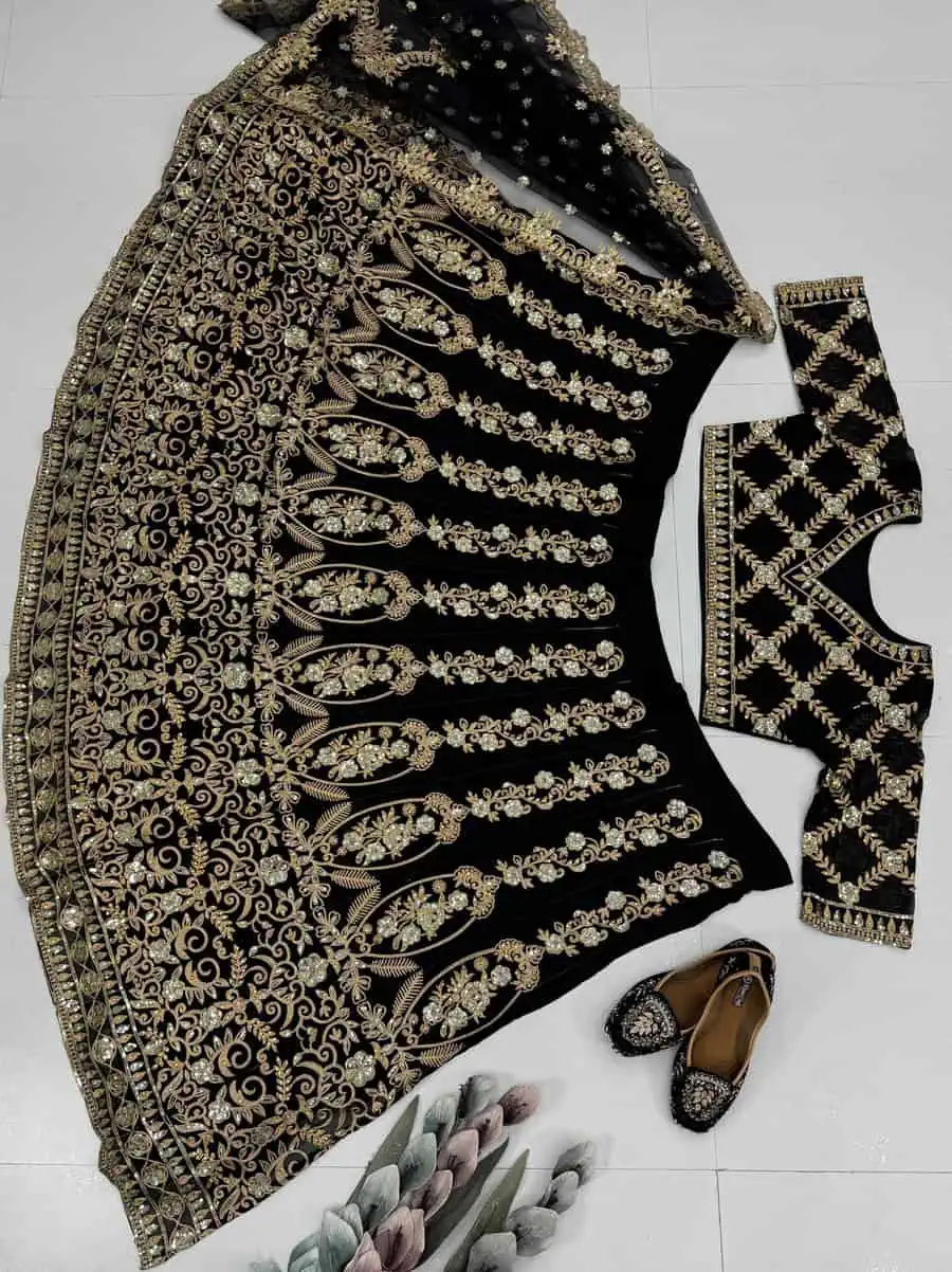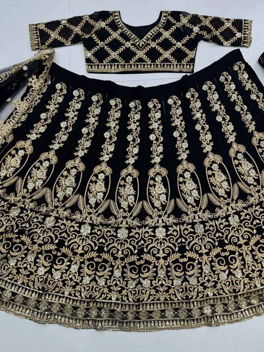 FANCE GEORGETTE CHAIN SEQUENCE WORK WITH DIMOND HAND WORK LEHENGA CHOLI WITH DUPATTA BLACK