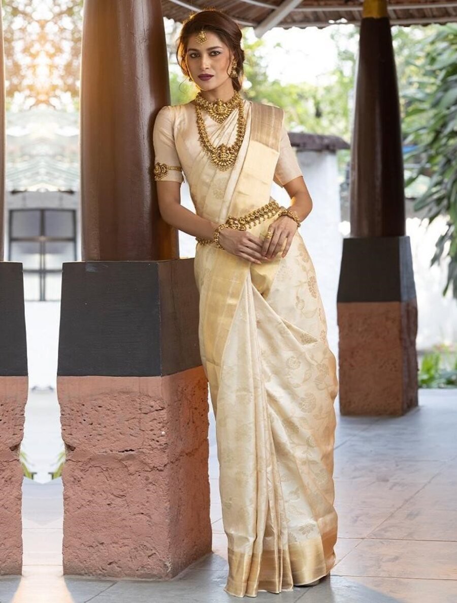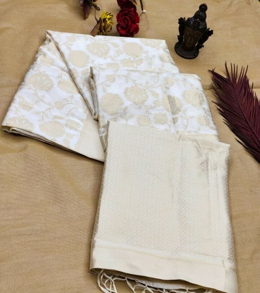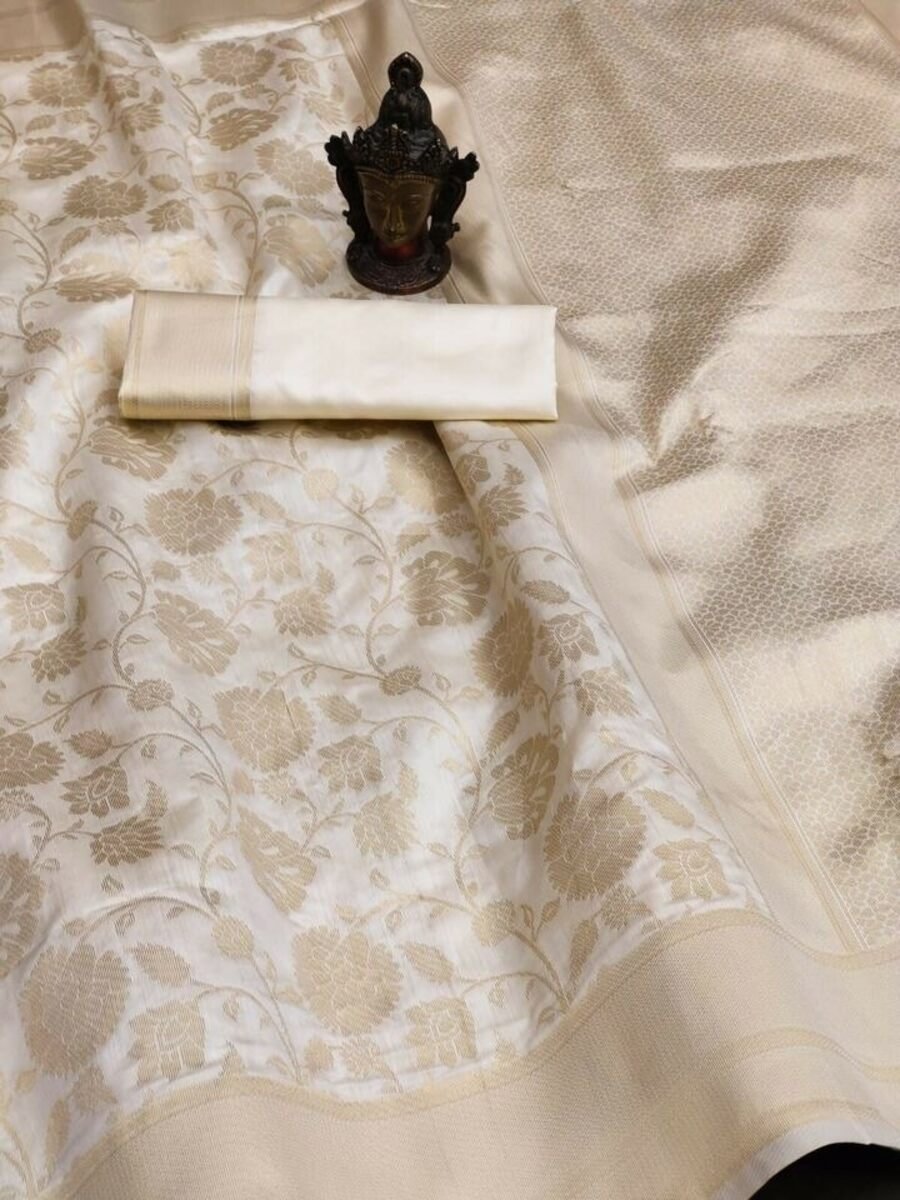 FANCY BANARASI SILK ZARI WEAVING WORK SAREE WITH UNSTITCHED BLOUSE OFF WHITE