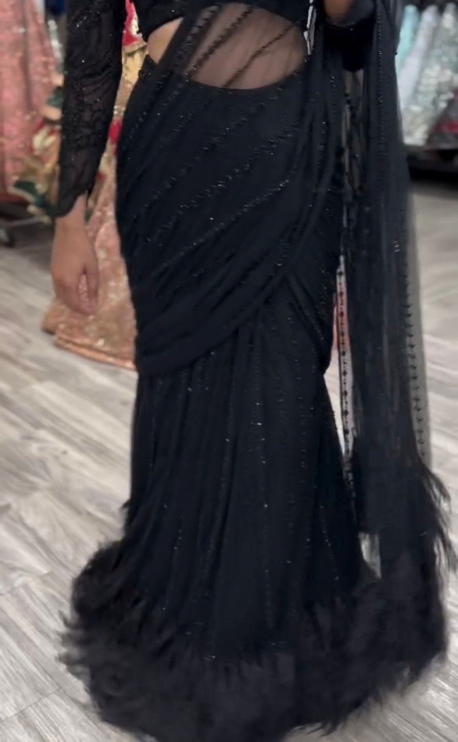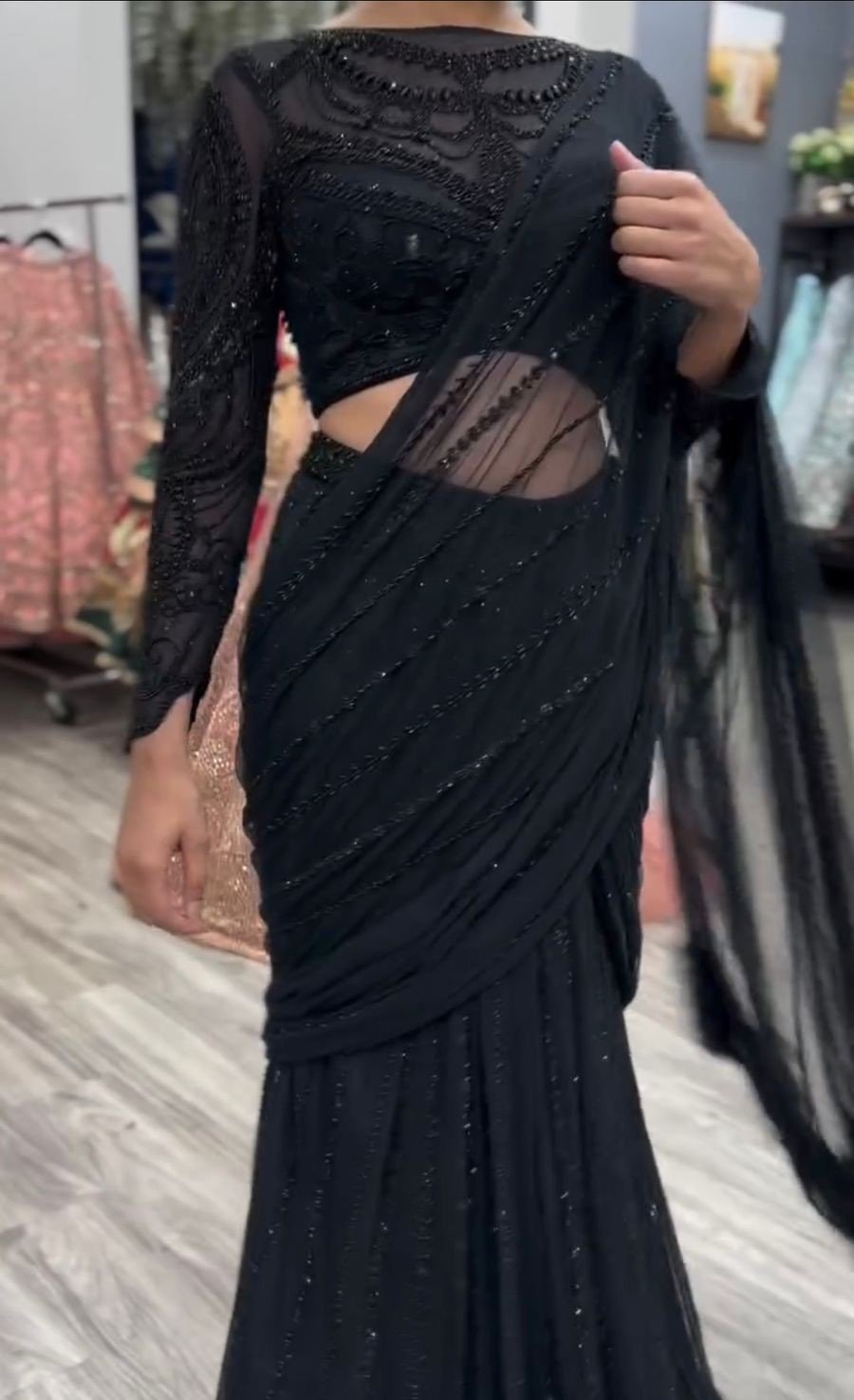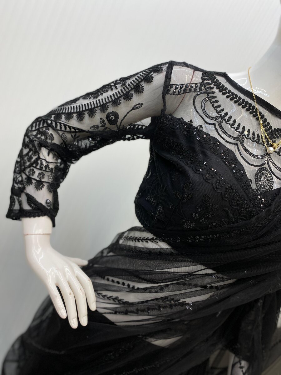FANCY BUTTER FLY NET SEQUENCE EMBROIDERY WORK LEHENGA SAREE WITH STITCHED BLOUSE BLACK