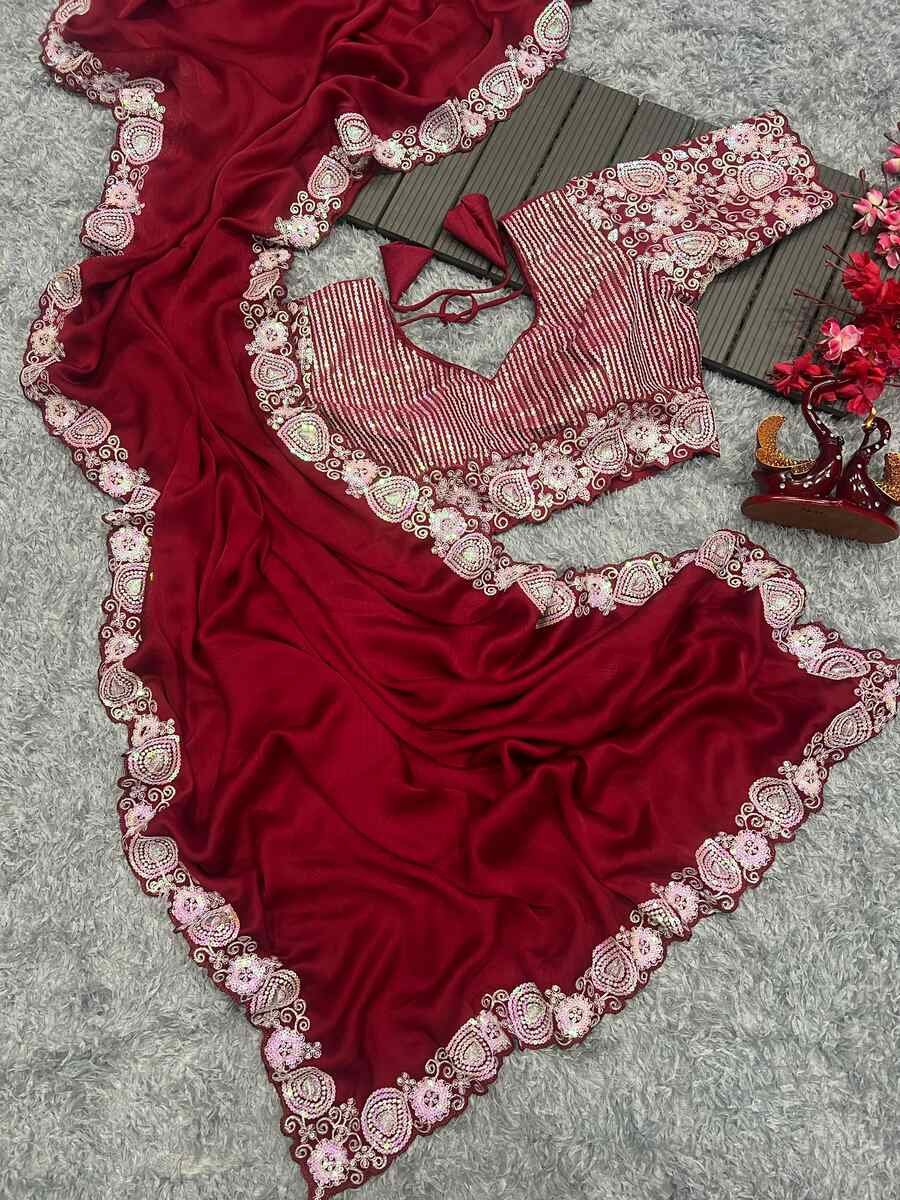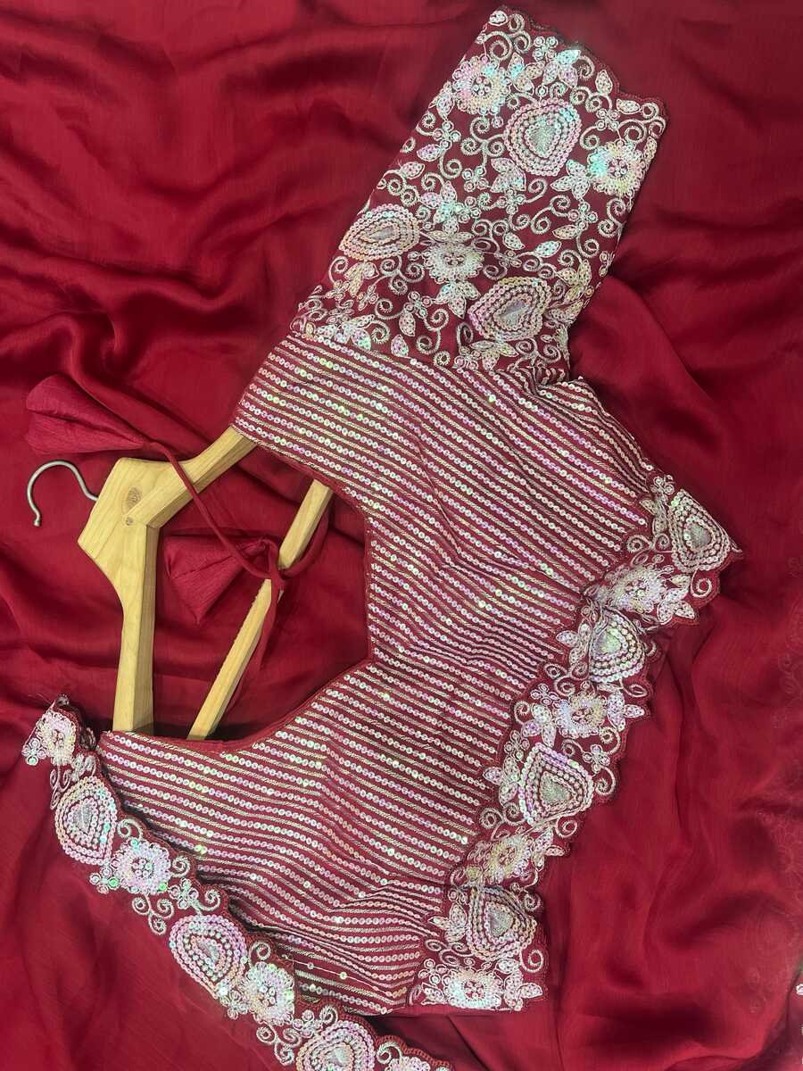 FANCY CHIFFON EMBROIDERY SEQUENCE WORK SAREE WITH UNSTITCHED BLOUSE RED