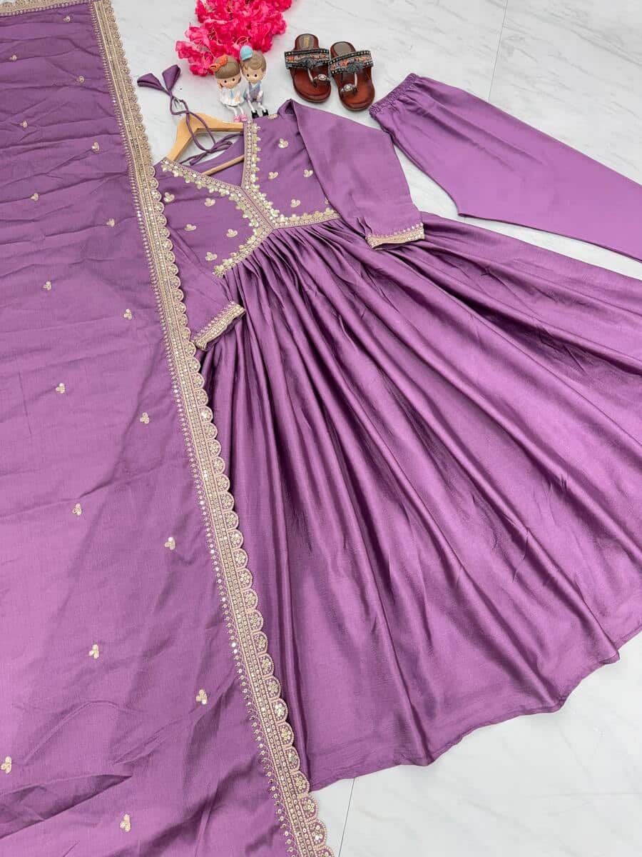 FANCY CHINON EMBROIDERY SEQUENCE WORK ALIA CUT GOWN BOTTOM WITH DUPATTA ONION