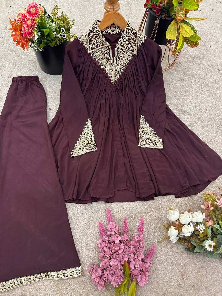 FANCY CHINON EMBROIDERY SEQUENCE WORK TOP PALAZZO SET WINE