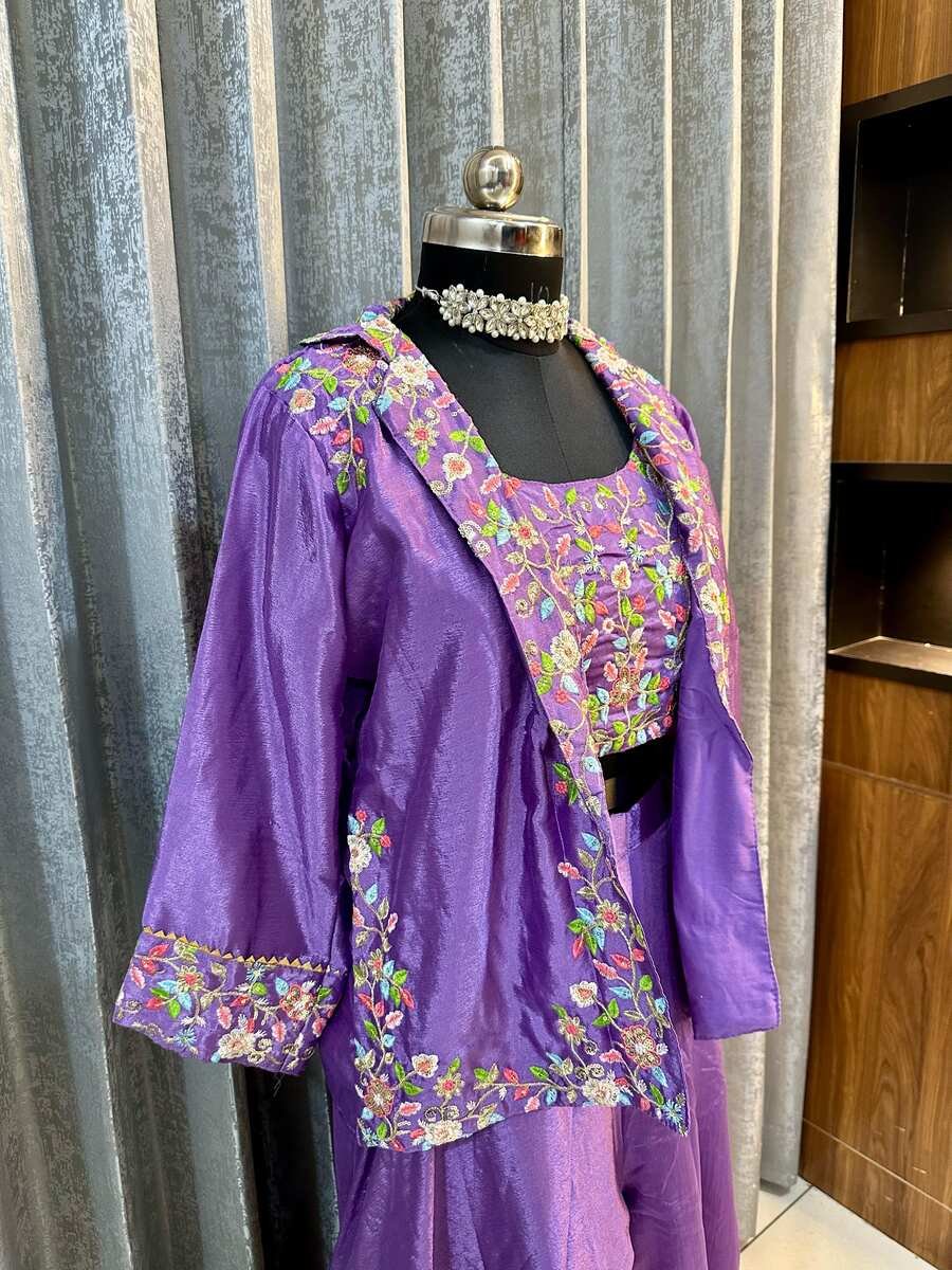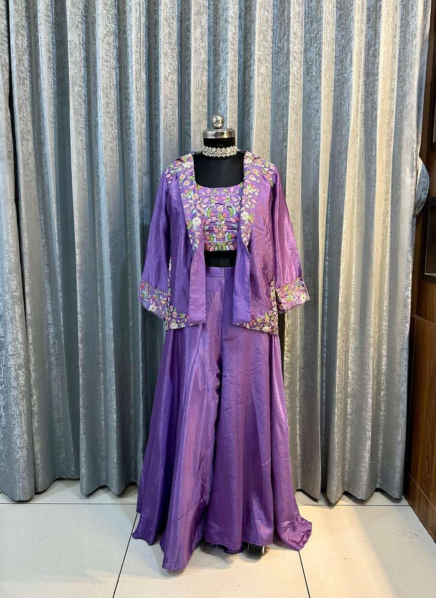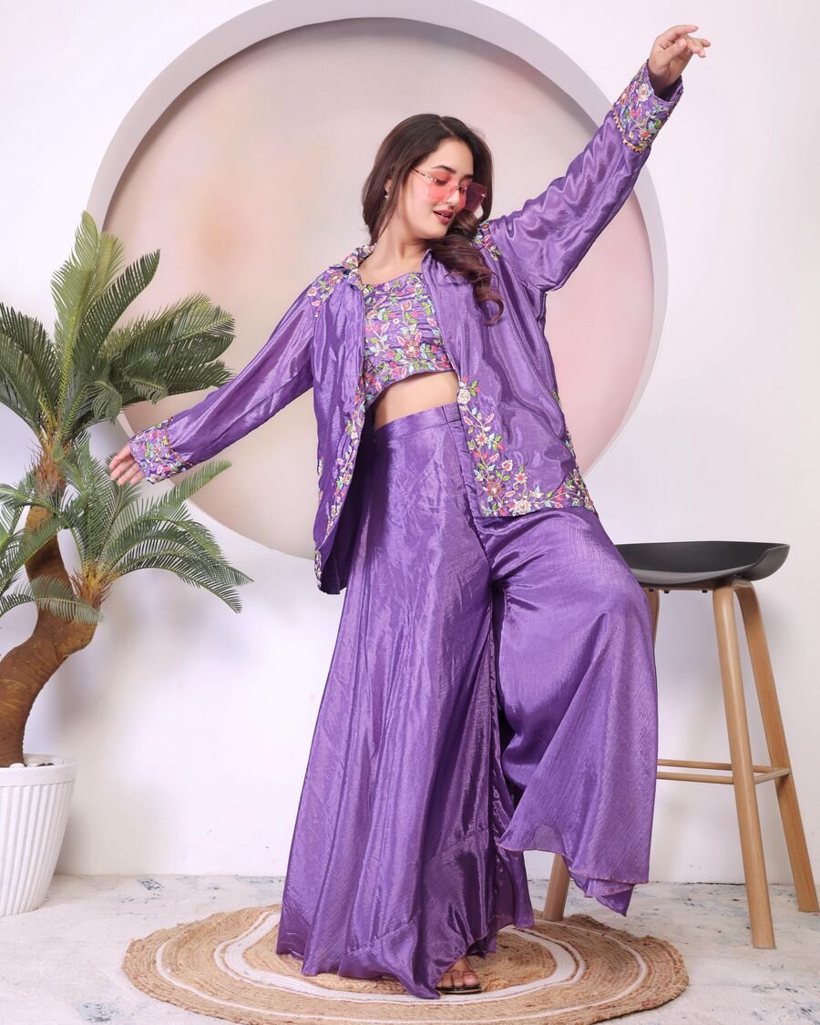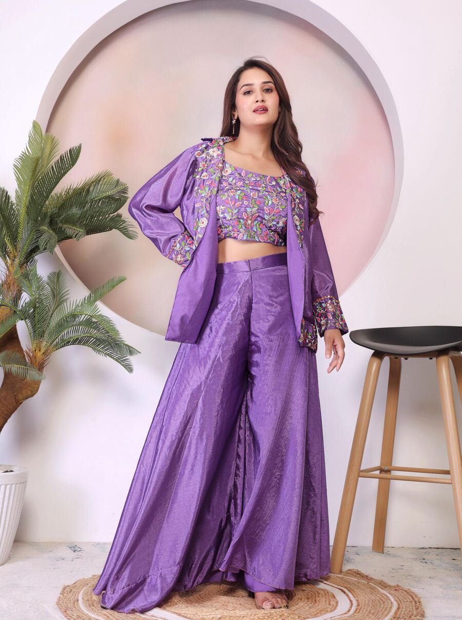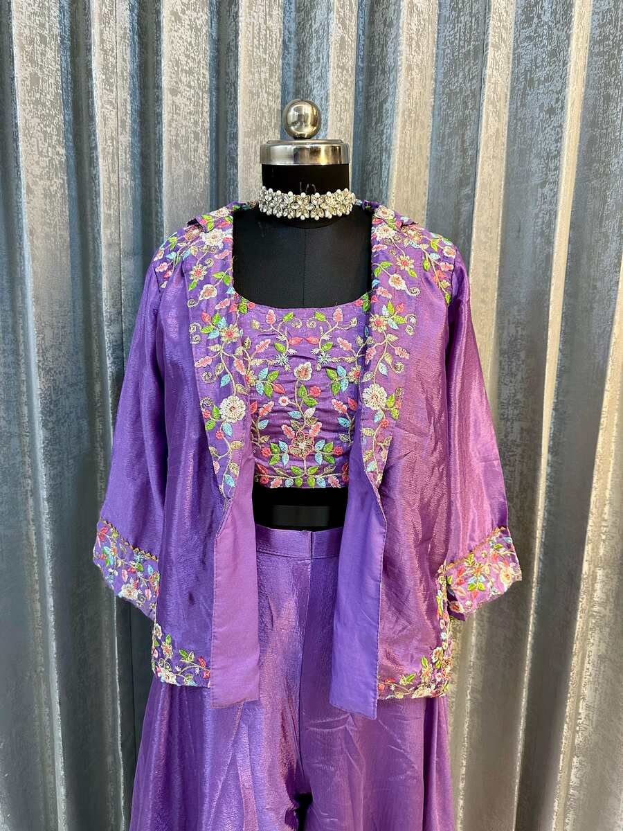 FANCY CHINON EMBROIDERY THREAD WORK STITCHED PALAZZO BLOUSE WITH KOTI LAVENDER