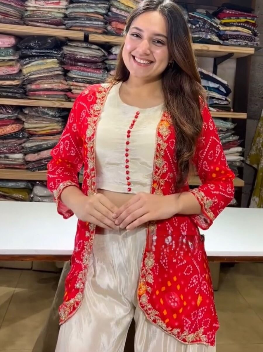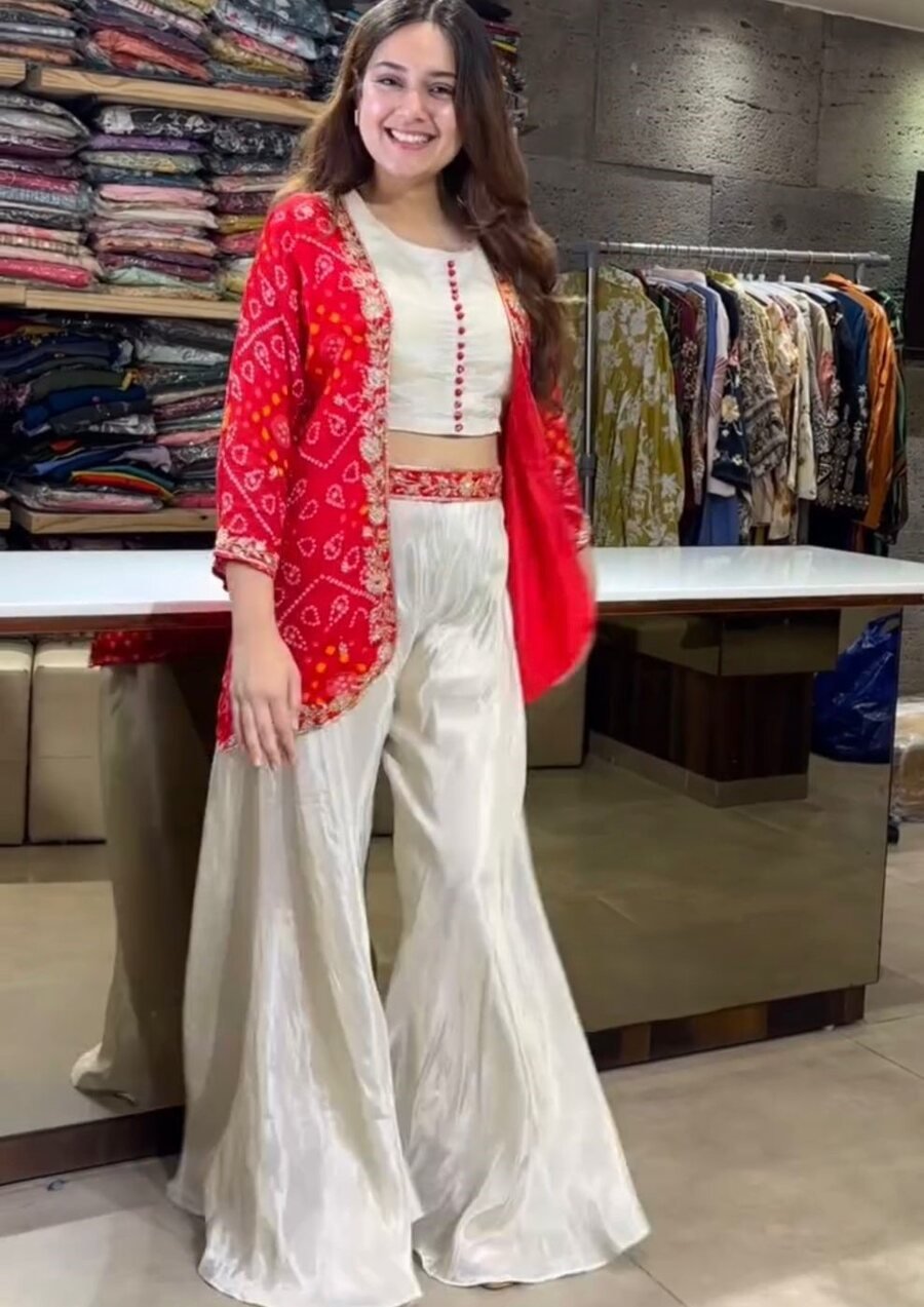 FANCY CHINON EMBROIDERY WORK TUBE BLOUSE PALAZZO WITH BANDHNI PRINTED KOTI RED