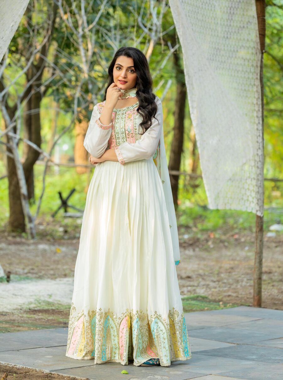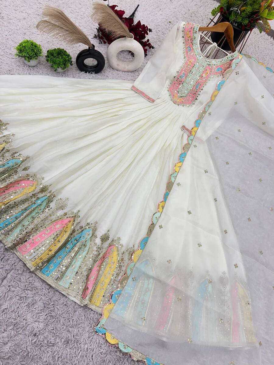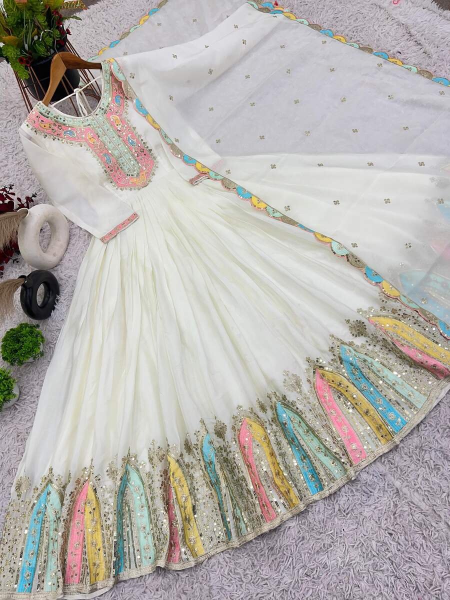GOWN FABRIC : HEAVY CHINON SILK WITH MULTI THREAD HEAVY 5MM EMBROIDERY SEQUENCE WORK