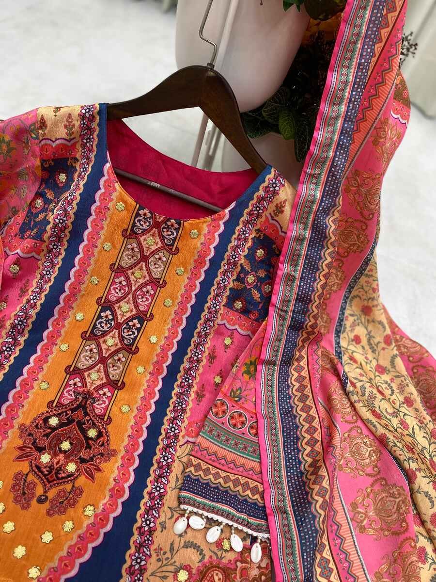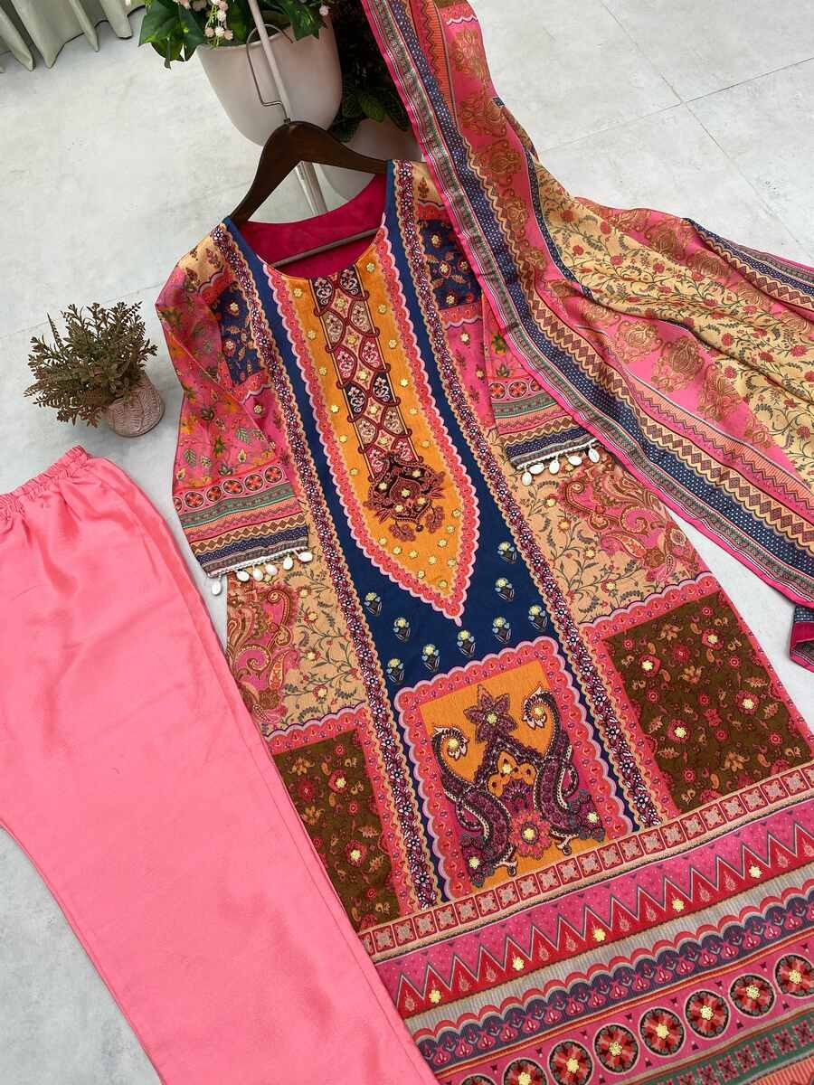 FANCY CHINON PRINTED MOTI LACE WORK TOP BOTTOM WITH DUPATTA PINK