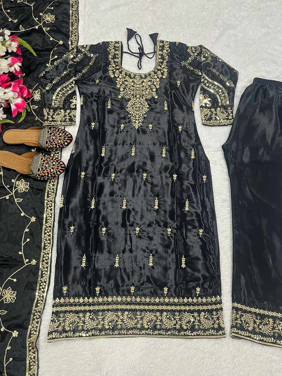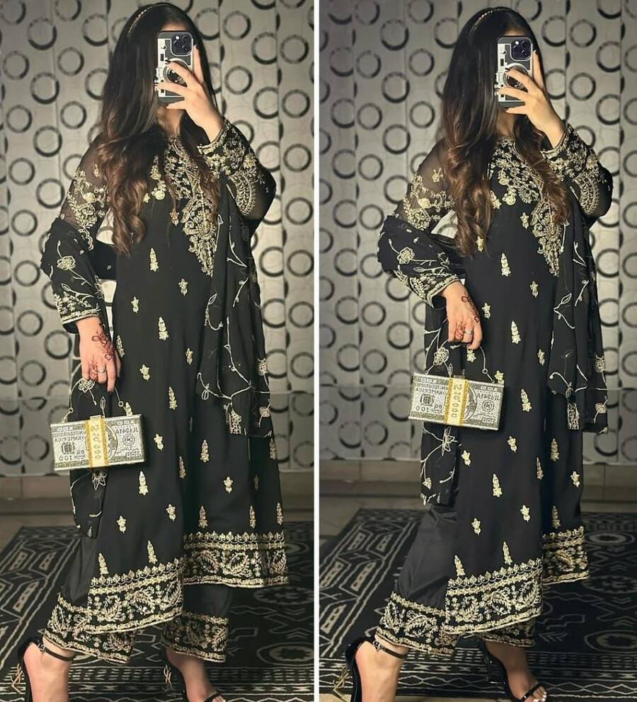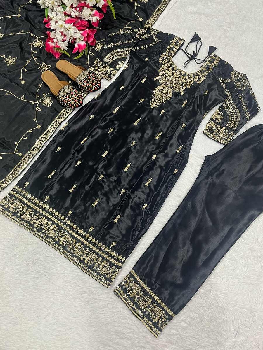 FANCY CHINON SILK EMBROIDERY CODING SEQUENCE WORK TOP BOTTOM WITH DUPATTA BLACK