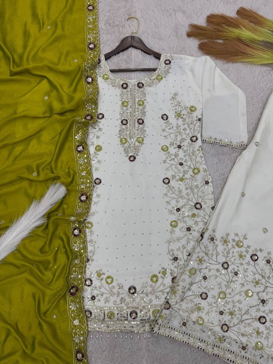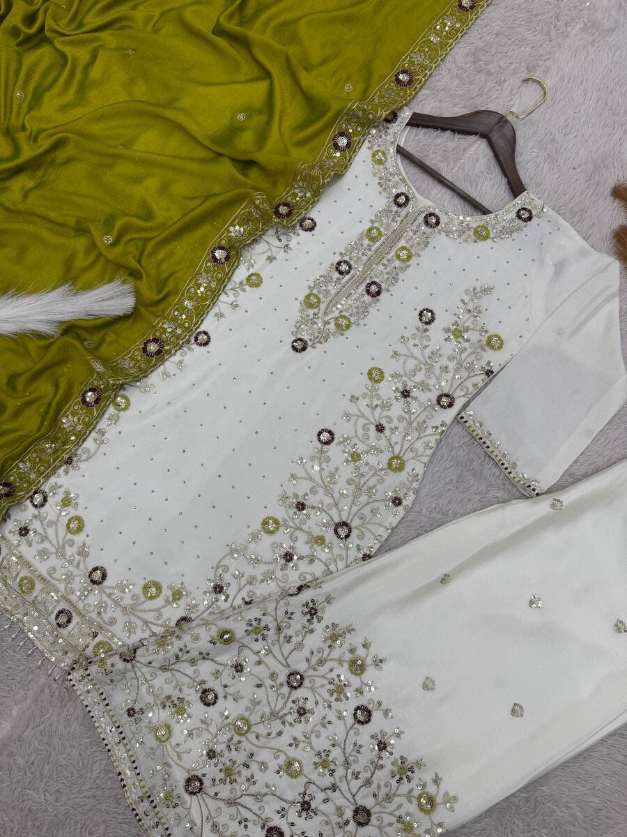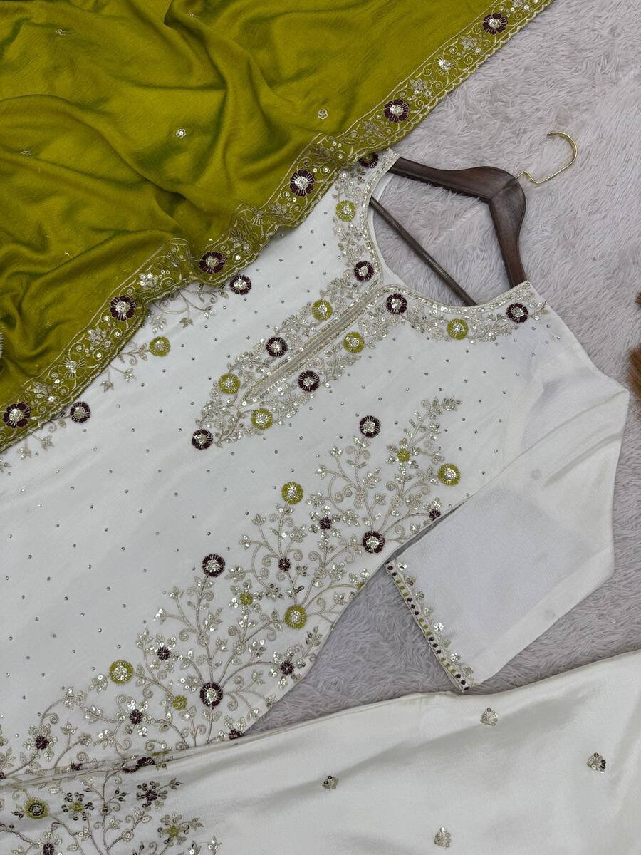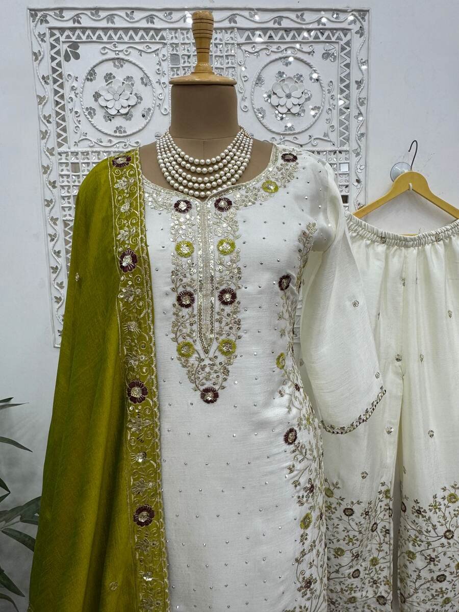 FANCY CHINON SILK EMBROIDERY SEQUENCE AND THREAD WORK WITH STONE HAND WORK TOP PALAZZO WITH DUPATTA PARROT GREEN
