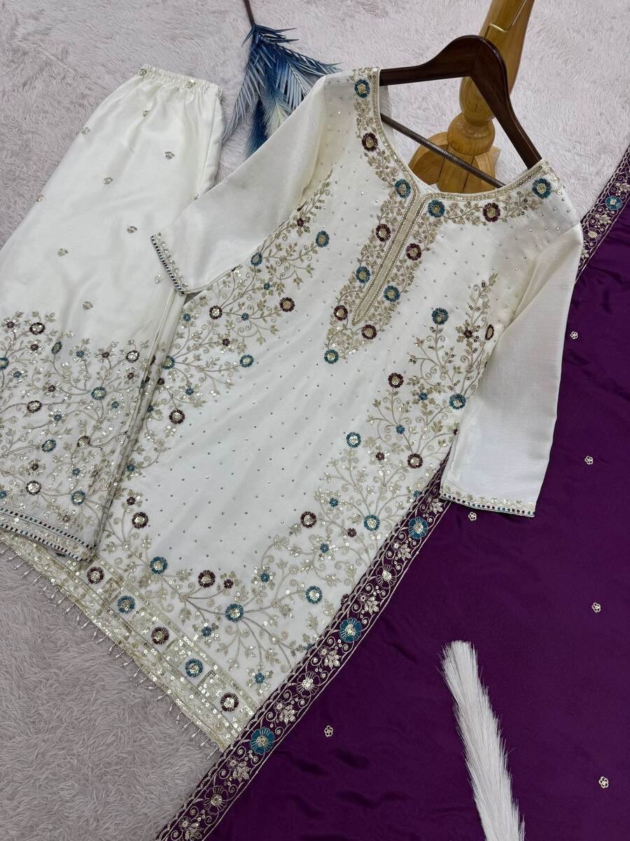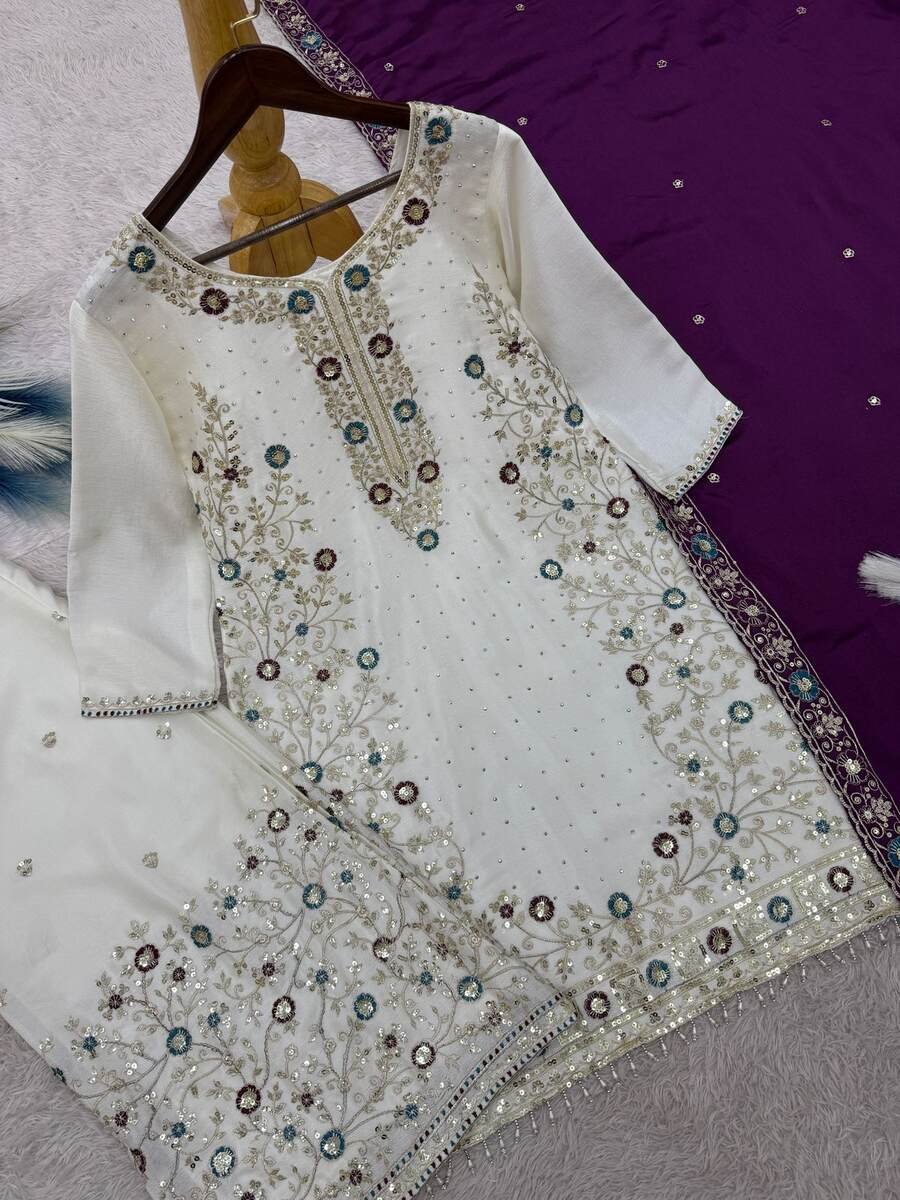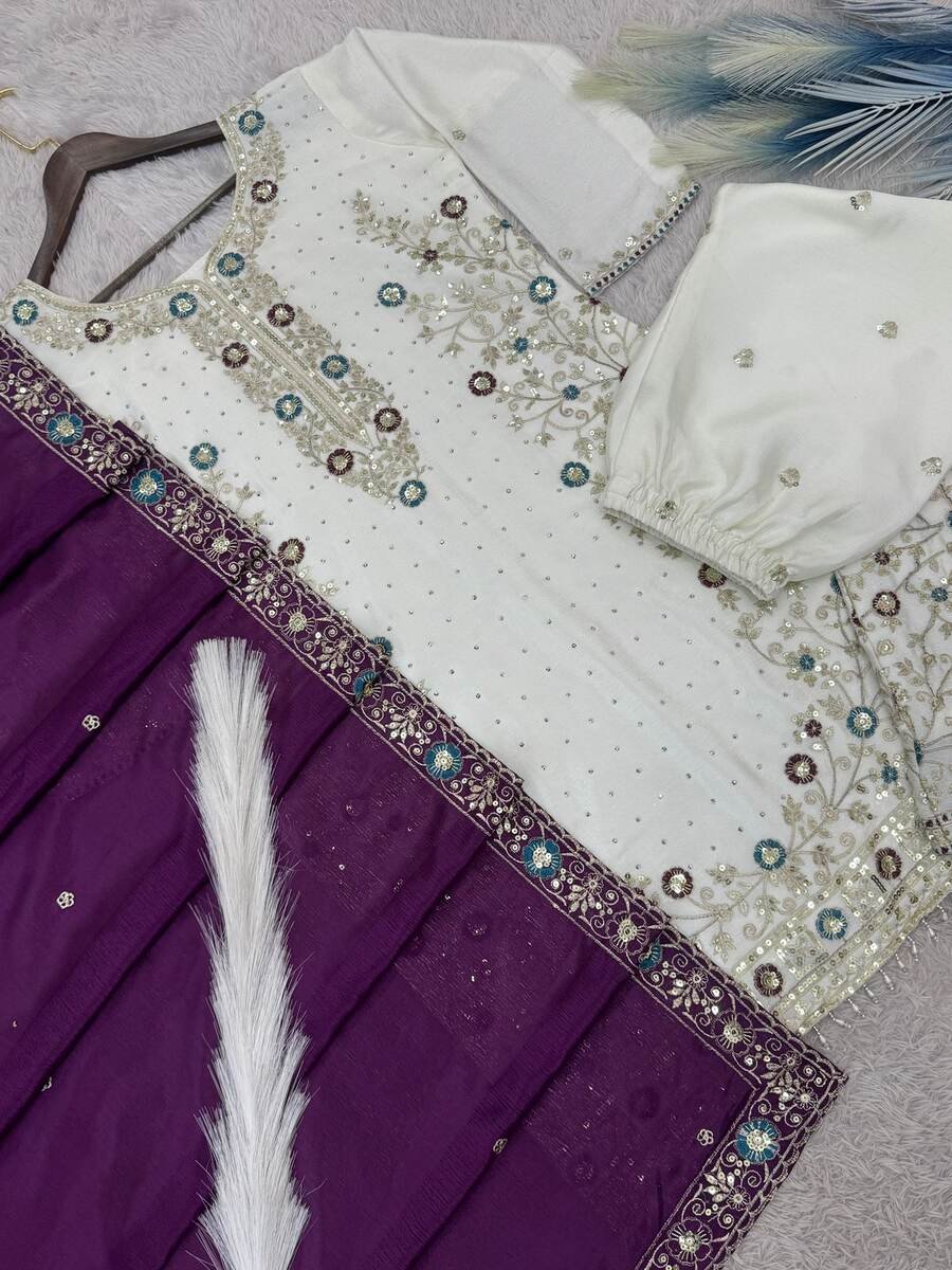 FANCY CHINON SILK EMBROIDERY SEQUENCE AND THREAD WORK WITH STONE HAND WORK TOP PALAZZO WITH DUPATTA PURPLE