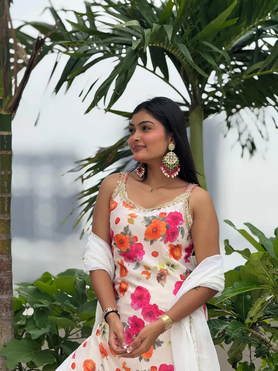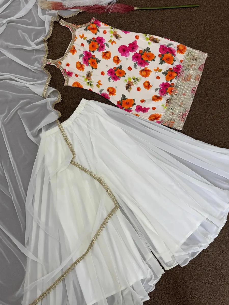 FANCY CHINON SILK EMBROIDERY SEQUENCE CODING WORK AND DIGITAL PRINT WORK TOP PALAZZO WITH DUPATTA WHITE AND RED