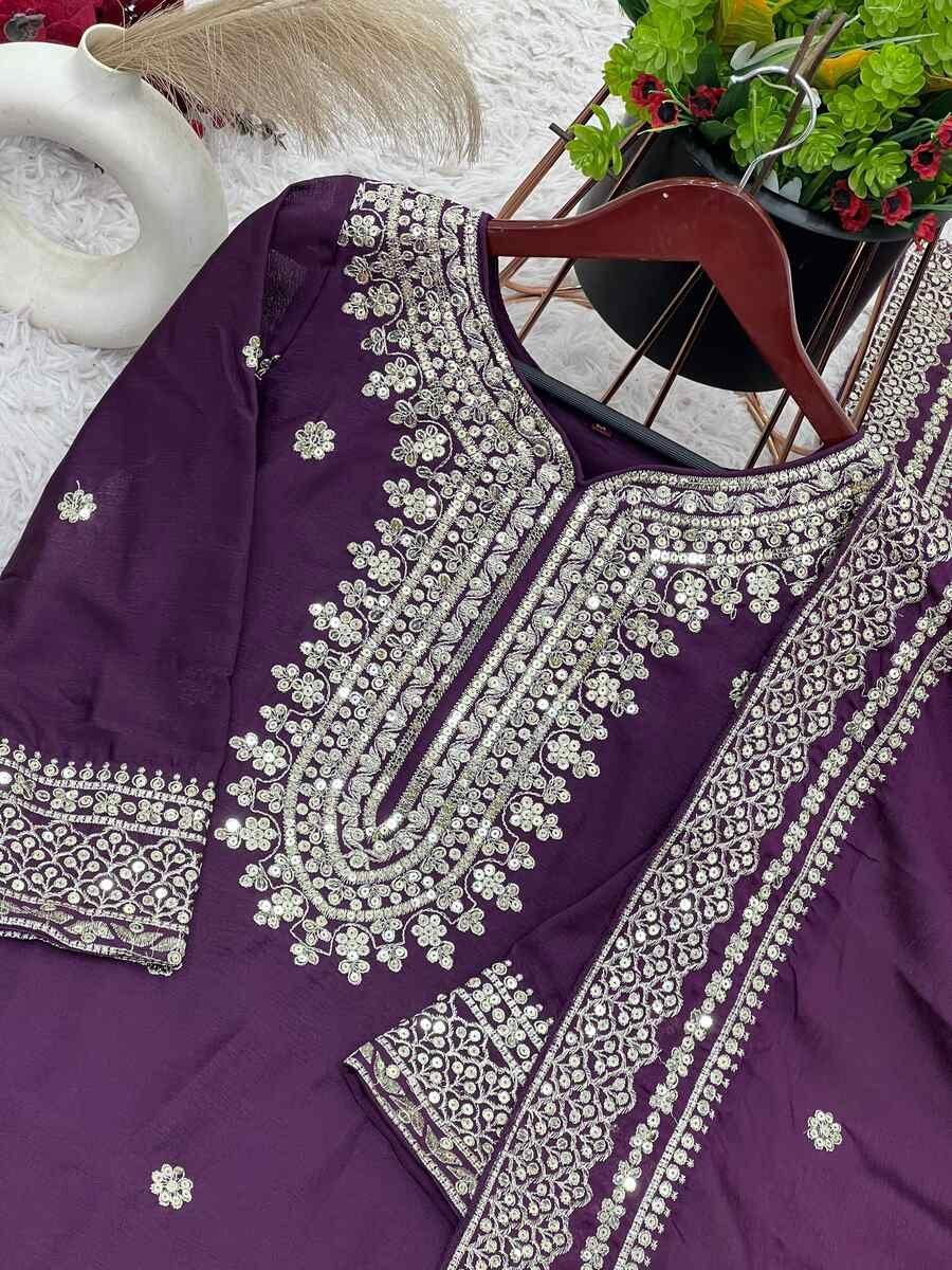 FANCY CHINON SILK EMBROIDERY SEQUENCE WORK TOP SHARARA WITH DUPATTA PURPLE