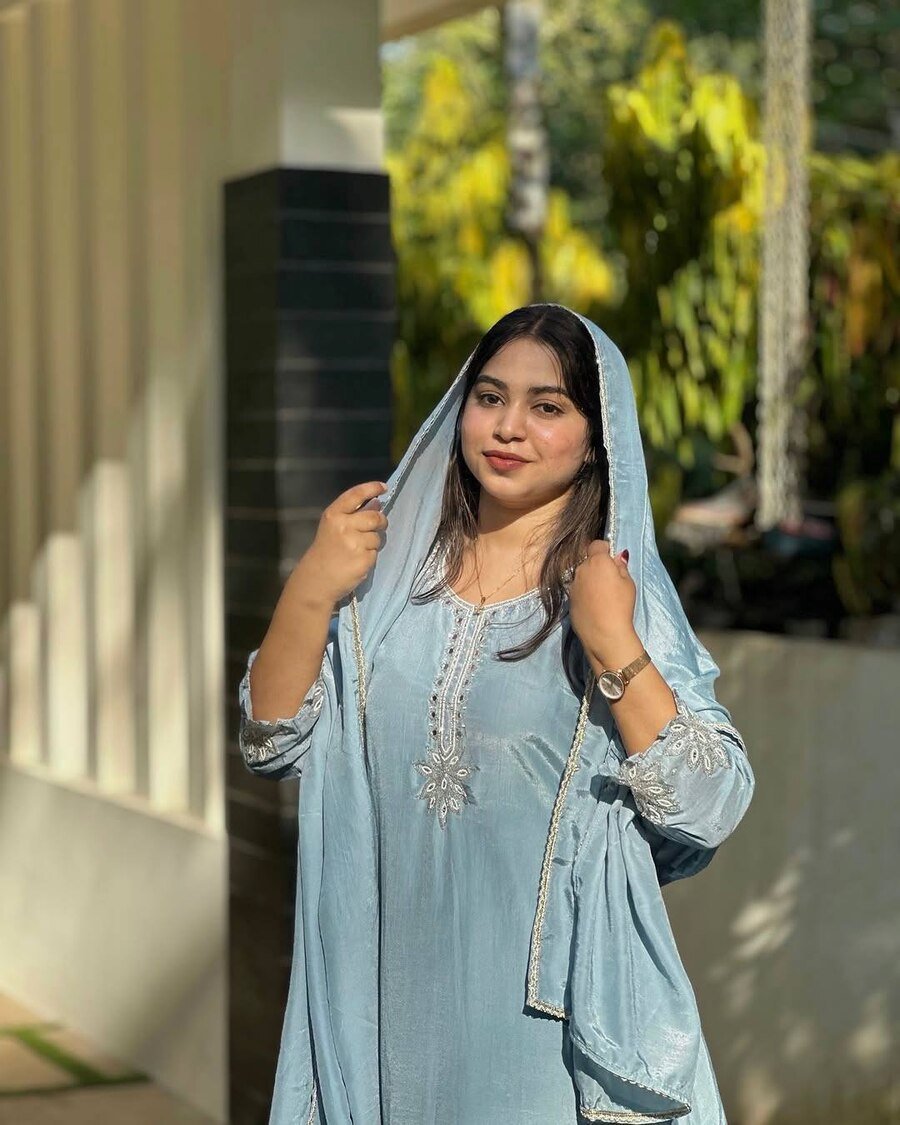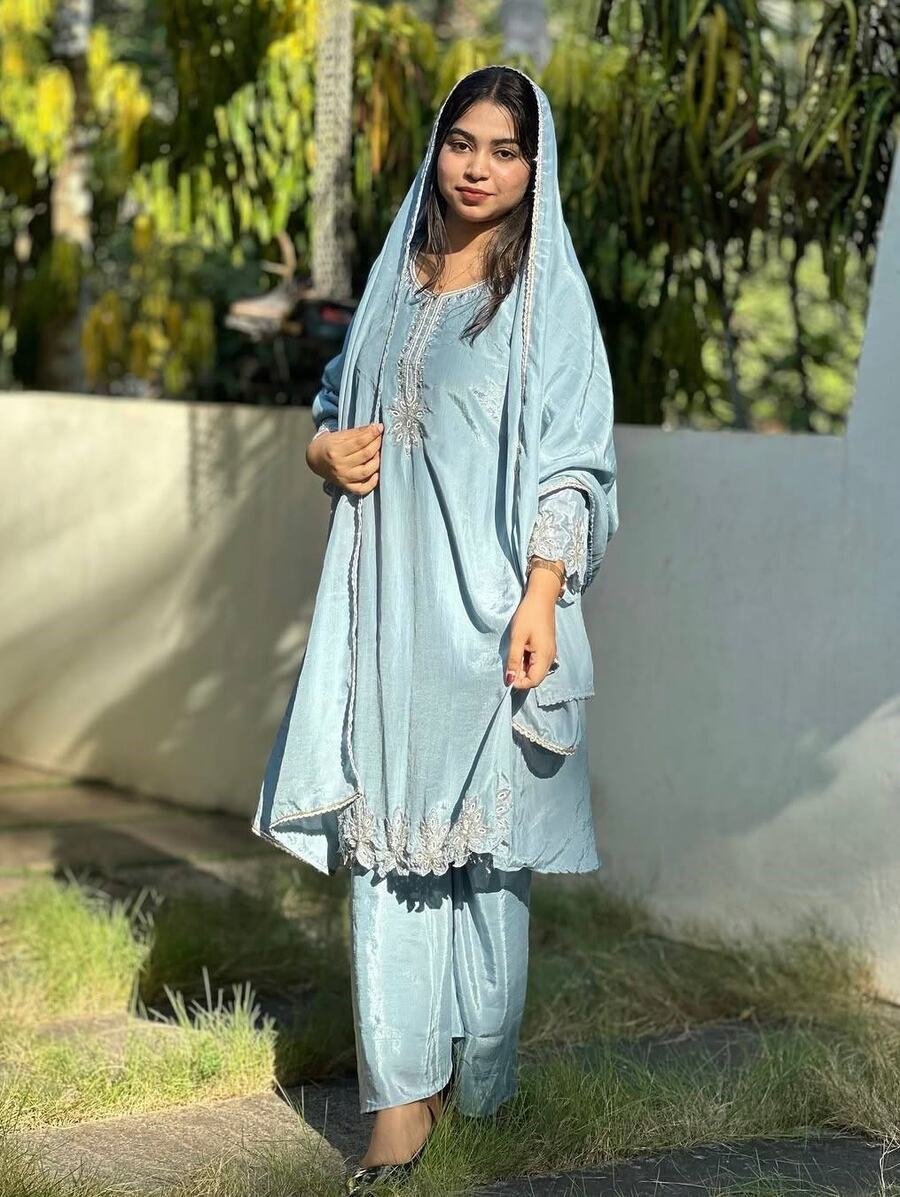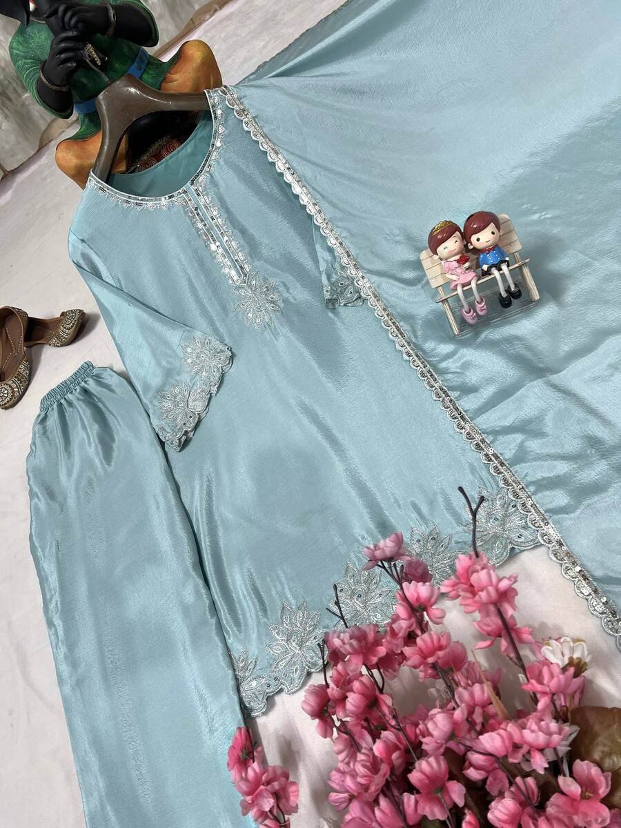 FANCY CHINON SILK SEQUENCE & ZARI EMBROIDERY WORK TOP PALAZZO WITH DUPATTA SKY
