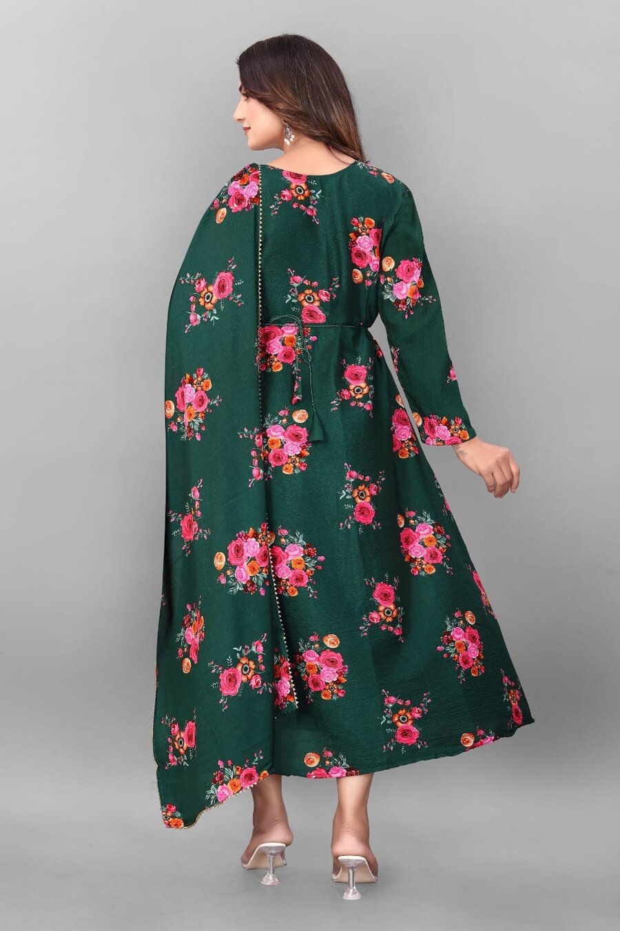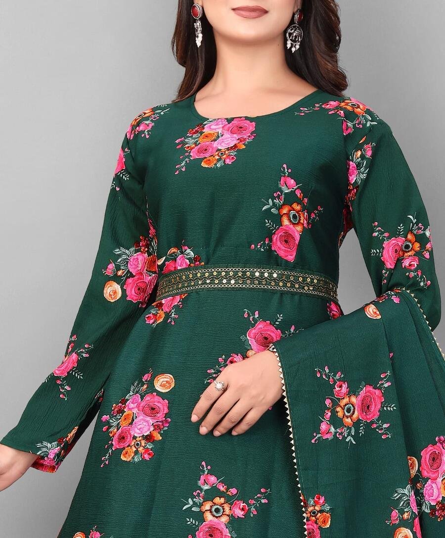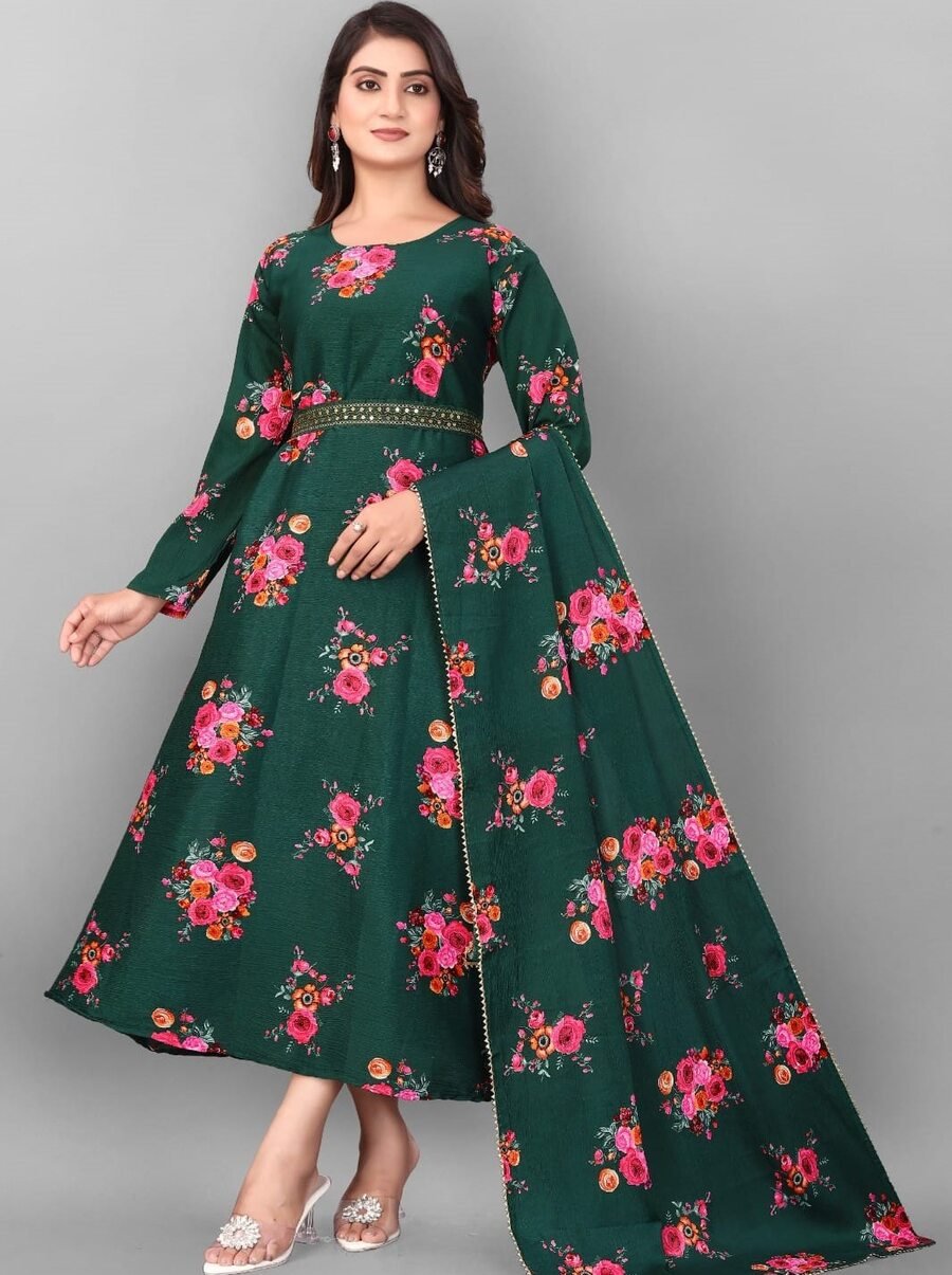 FANCY DELTA COTTON FLORAL PRINT WORK ANARKALI GOWN WITH DUPATTA SET GREEN