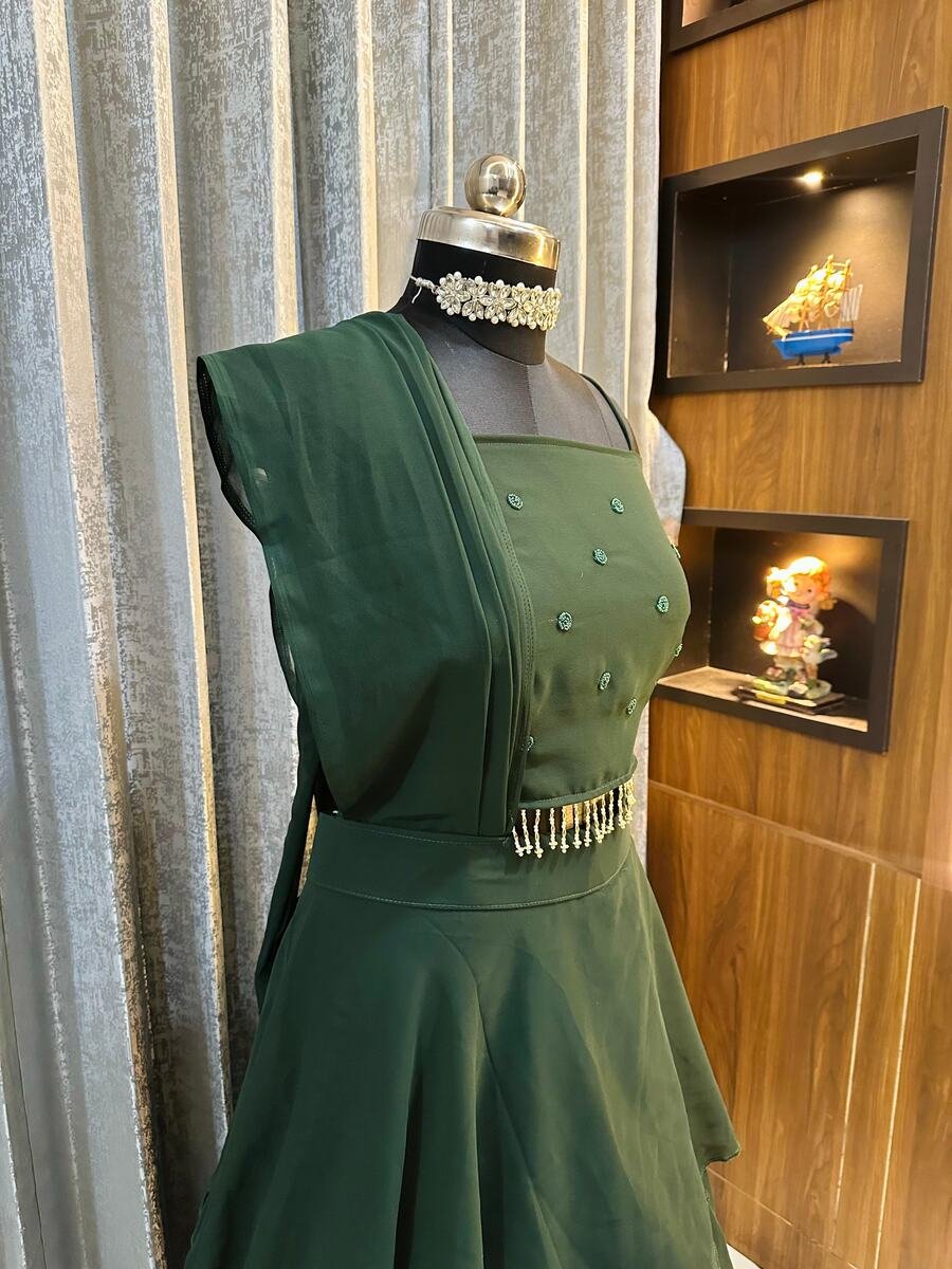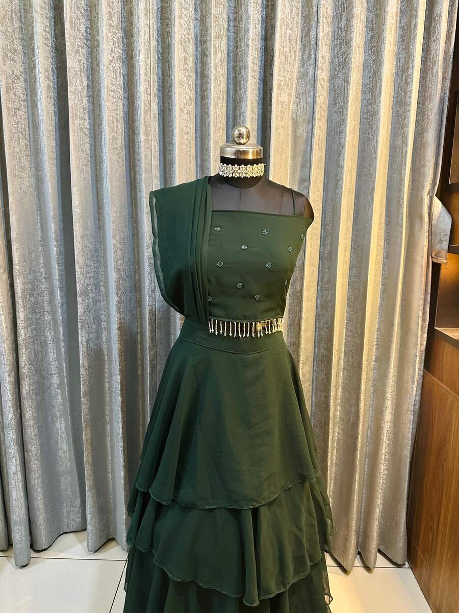 FANCY GEORGETTE CUT DANA WORK CHOLI AND LAYRED LEHENG WITH ATTACHED DUPATTA GREEN