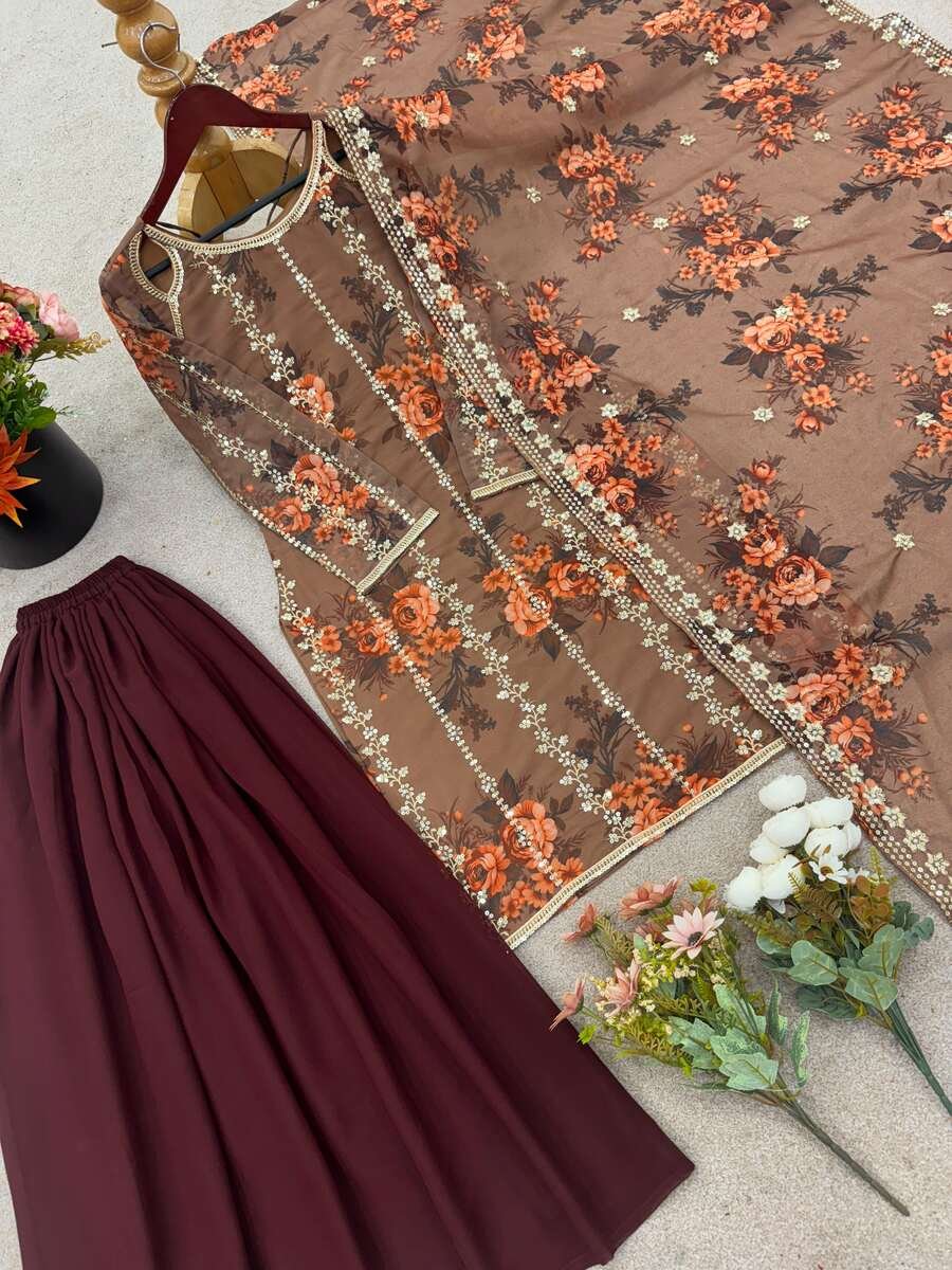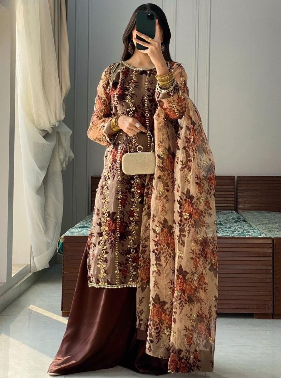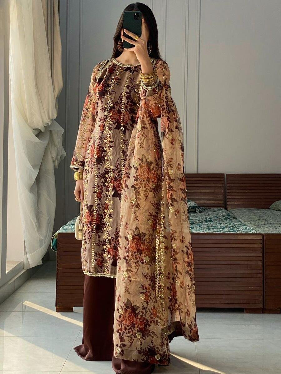 FANCY GEORGETTE DIGITAL PRINTED WITH EMBROIDERY SEQUENCE AND RIVET MOTI WORK TOP PALAZZO WITH DUPATTA CHIKU