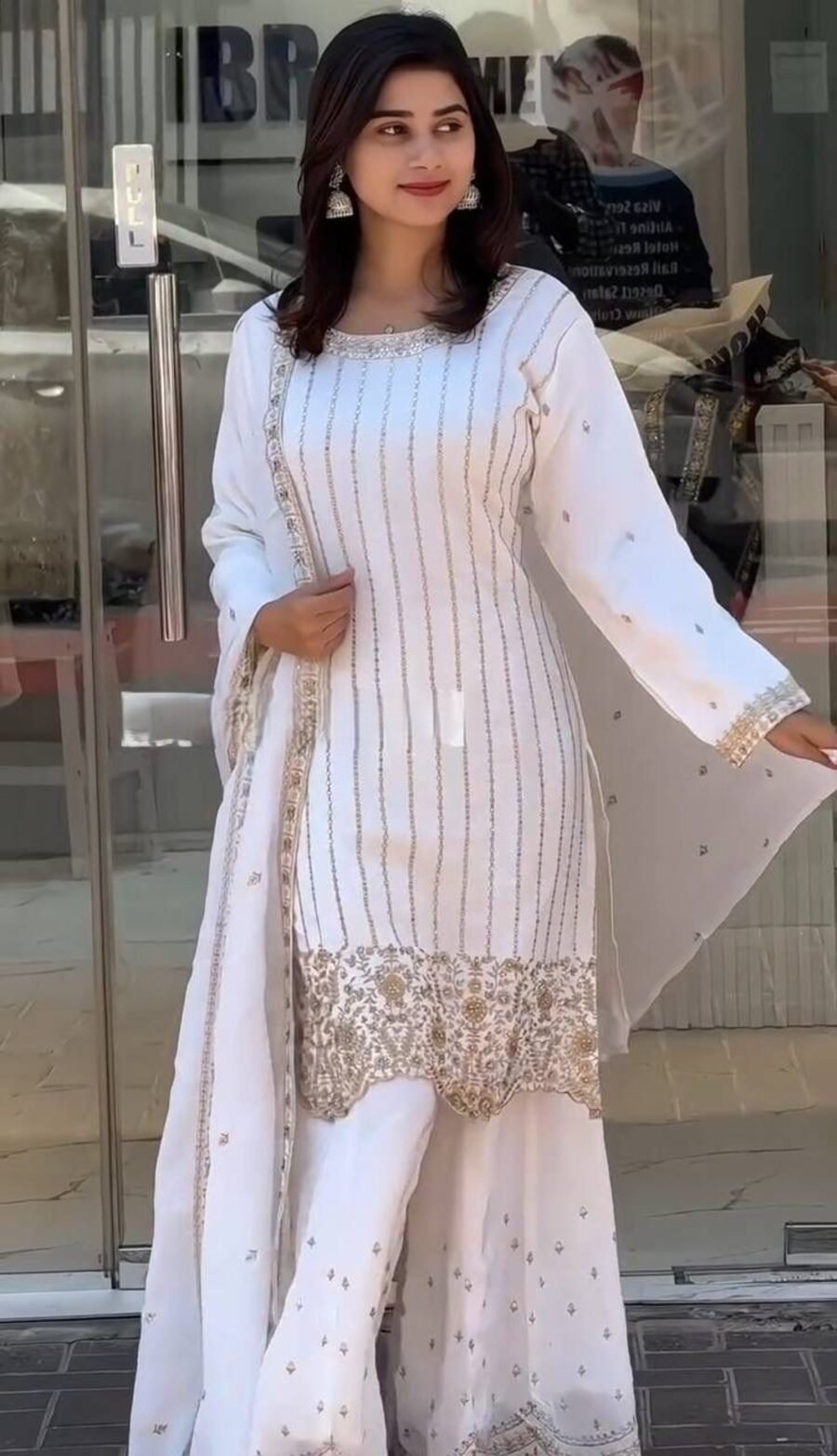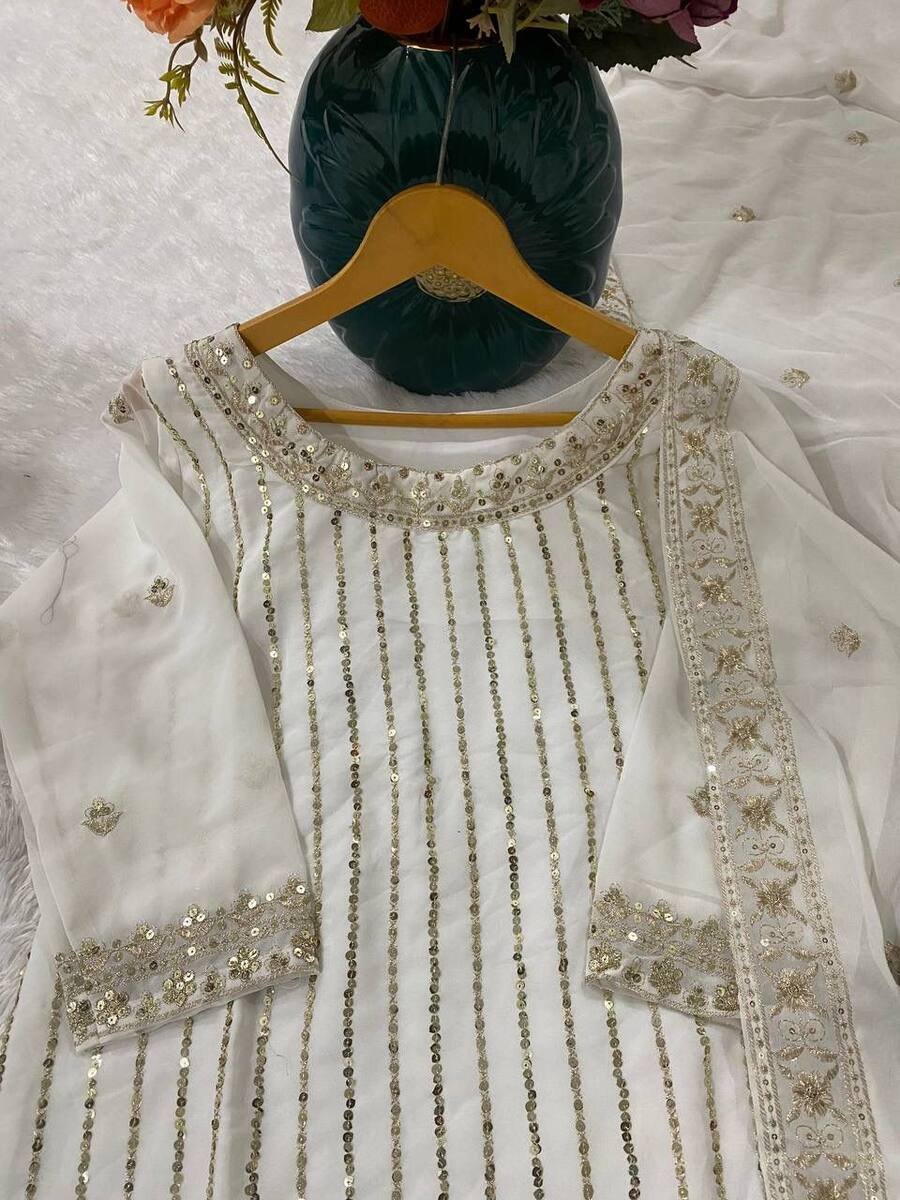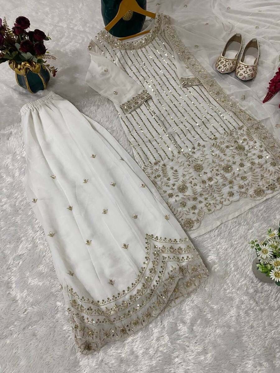 FANCY GEORGETTE EMBROIDERY WITH THREAD AND SEQUENCE WORK TOP PALAZZO WITH DUPATTA WHITE