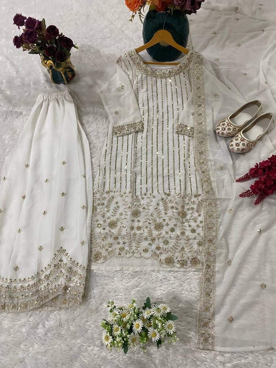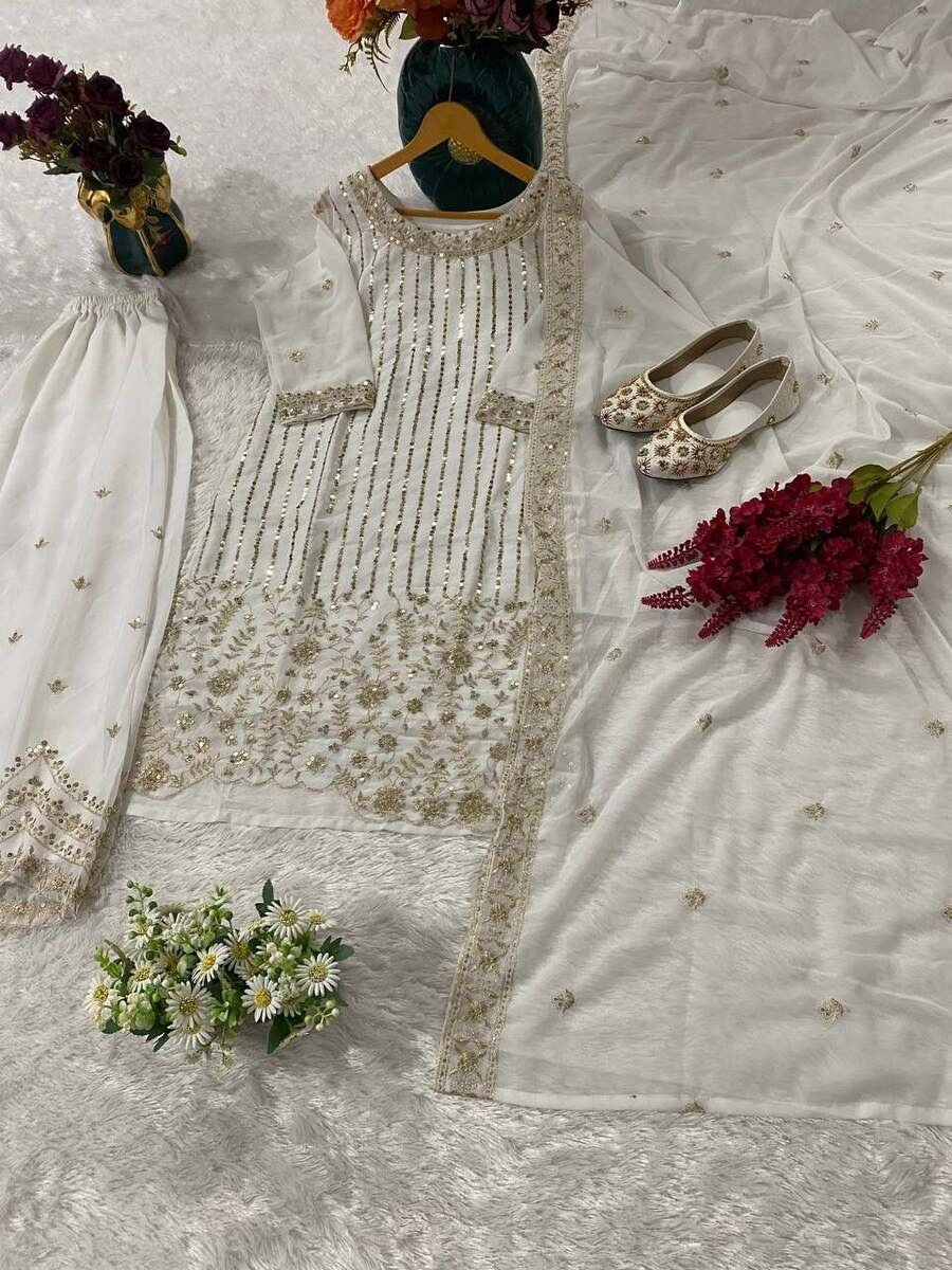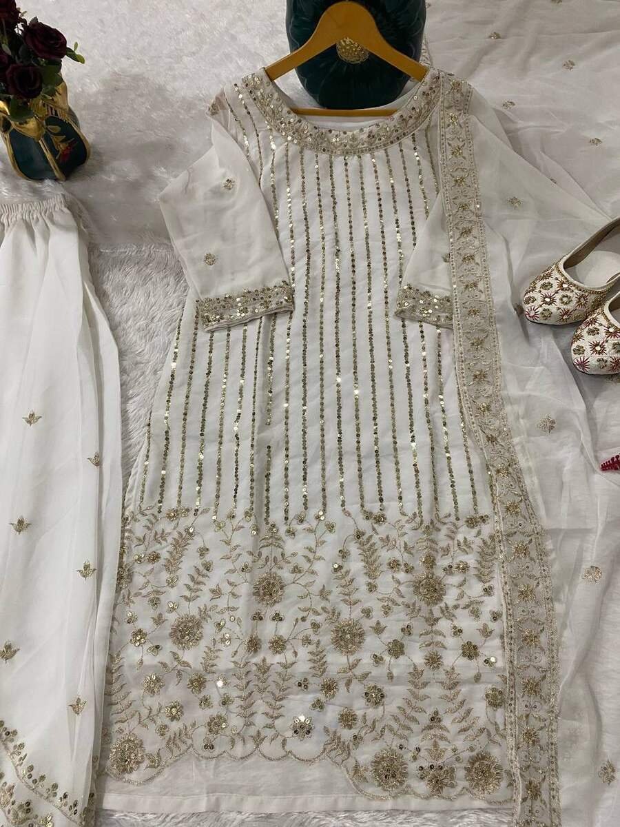 FANCY GEORGETTE EMBROIDERY WITH THREAD AND SEQUENCE WORK TOP PALAZZO WITH DUPATTA WHITE