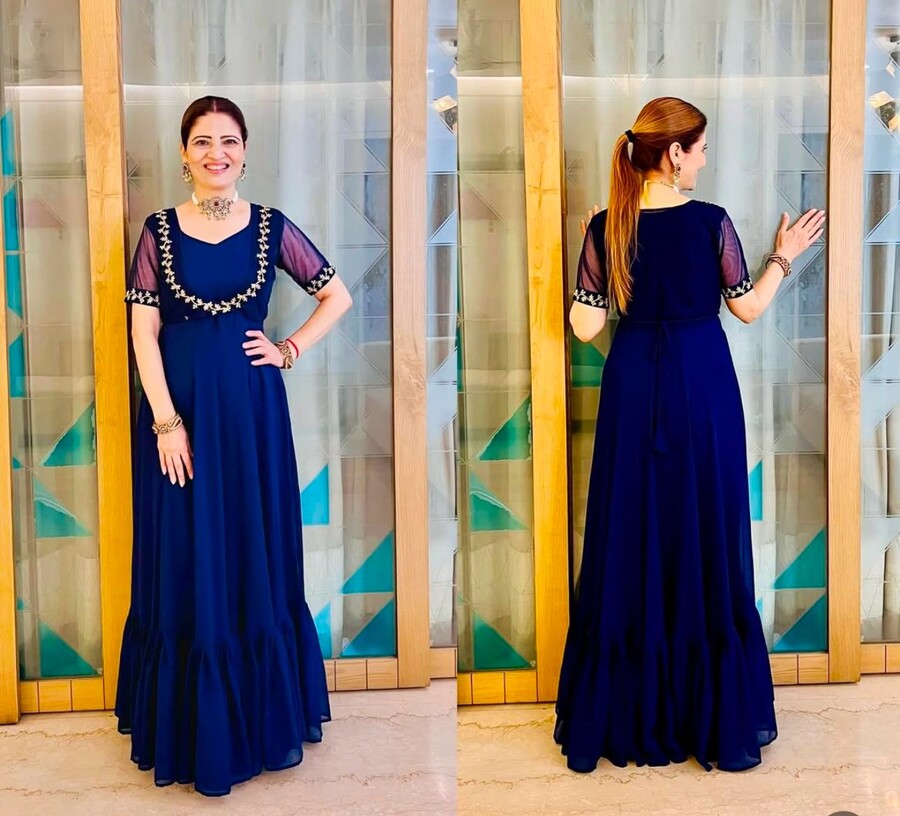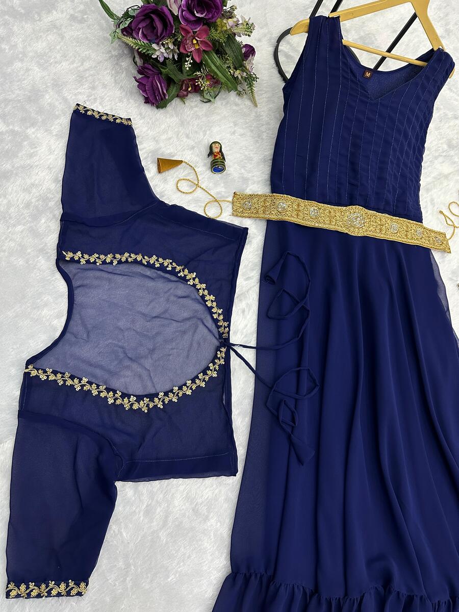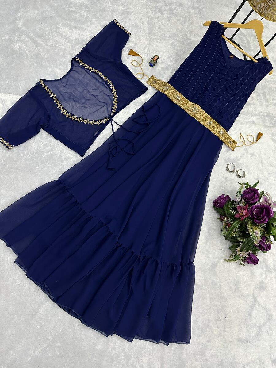 FANCY GEORGETTE EMBROIDERY WORK ON NACK GOWN WITH KOTI AND WASIT BELT NAVY BLUE