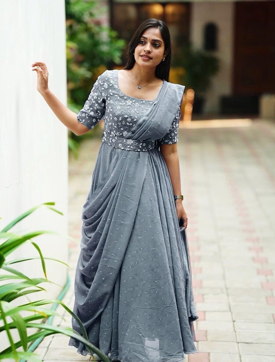 FANCY GEORGETTE SEQUENCE ZARI AND THREAD EMBROIDERY WORK GOWN ATTACHED DUPATTA AND WAIST BELT GREY