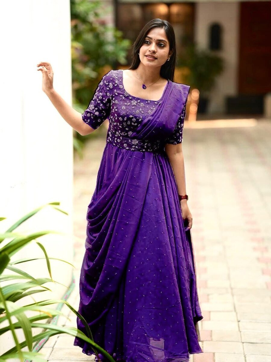 FANCY GEORGETTE SEQUENCE ZARI AND THREAD EMBROIDERY WORK GOWN ATTACHED DUPATTA AND WAIST BELT PURPLE