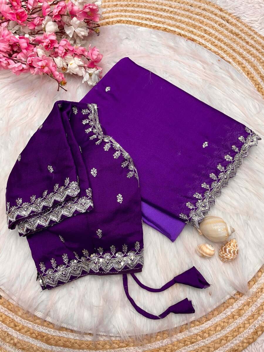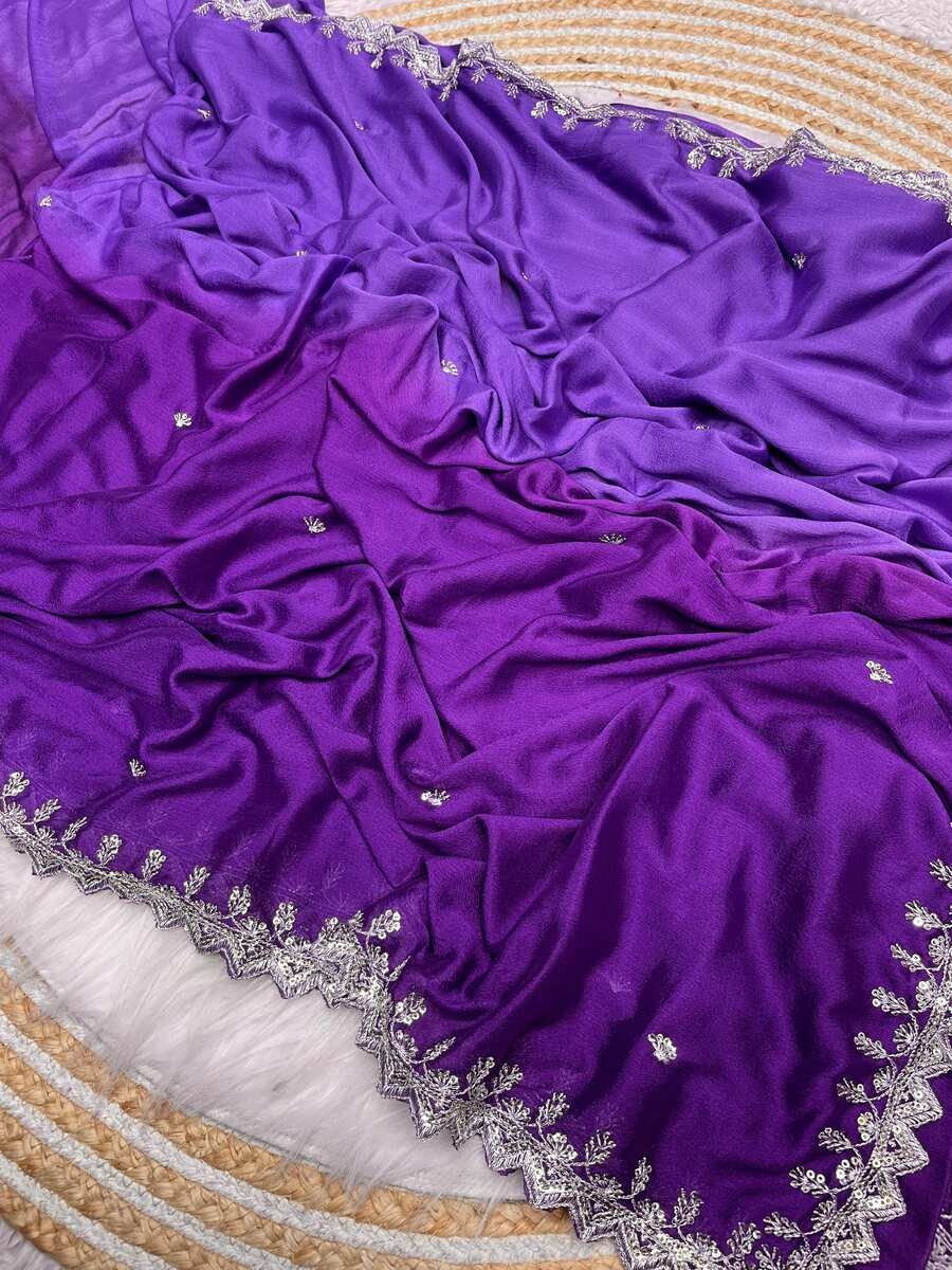 FANCY HAND DYEING CHINON EMBROIDERY SEQUENCE AND JARI WORK AND BORDER ARCA WORK SAREE WITH UNSTITCHED BLOUSE PURPLE