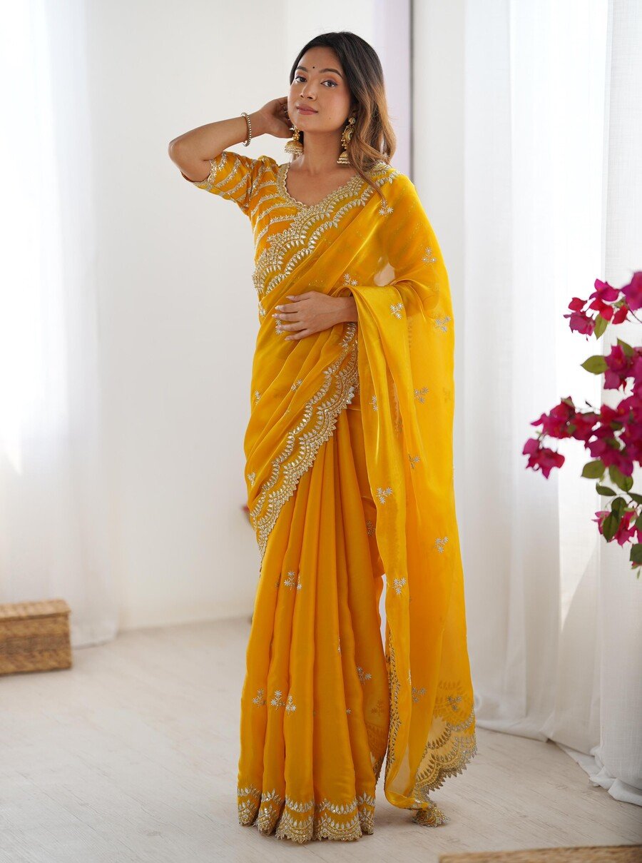 FANCY JIMMY CHOO THREAD SEQUENCE WORK SAREE WITH UNSTITCHED BLOUSE YELLOW