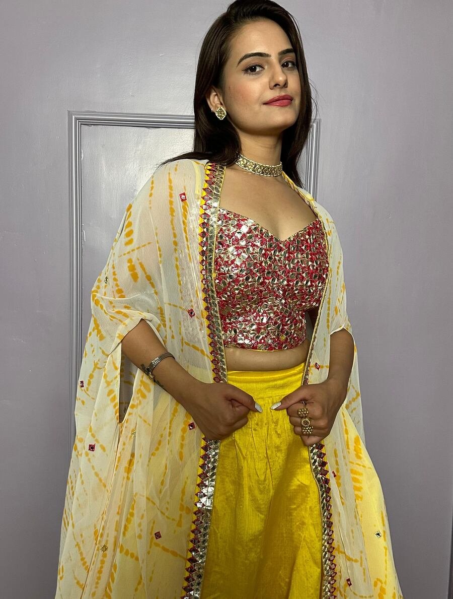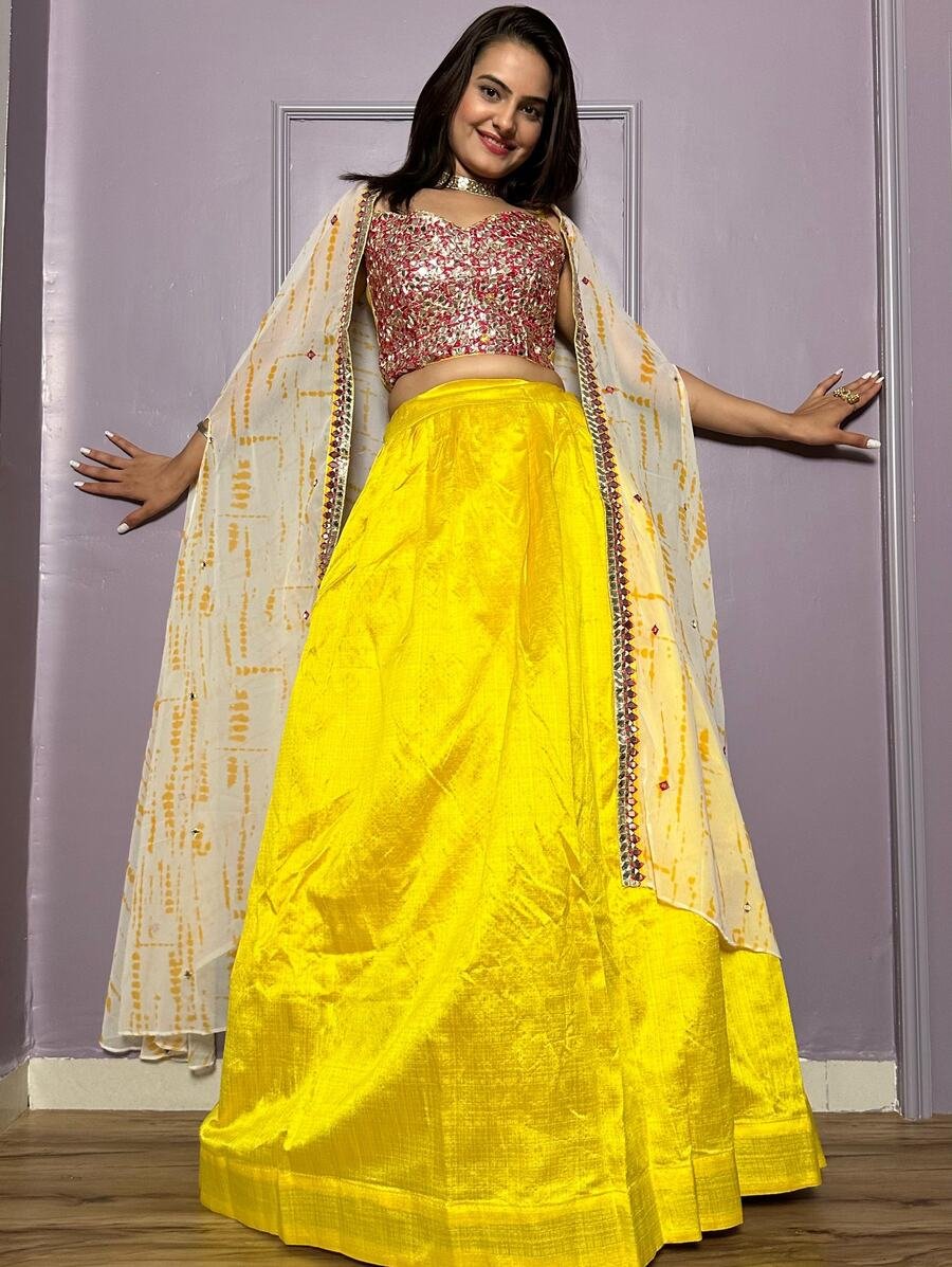 FANCY KASTURI SILK PLAIN LEHENGA WITH FOIL MIRROR WORK AND THREAD WORK CHOLI AND SHRUG YELLOW
