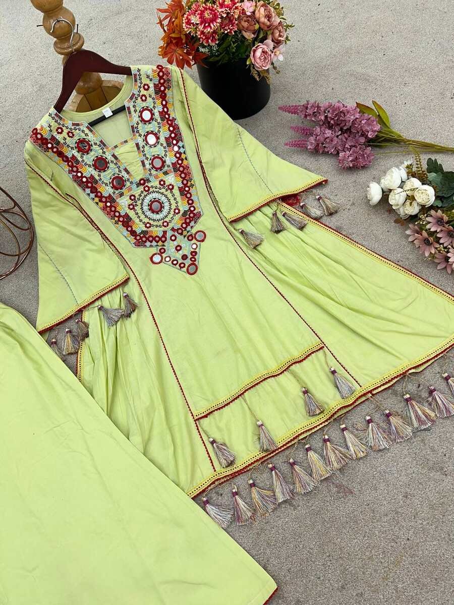 FANCY KHADI COTTON EMBROIDERY SEQUENCE WORK WITH REAL MIRROR WORK KURTI PALAZZO SET PARROT GREEN