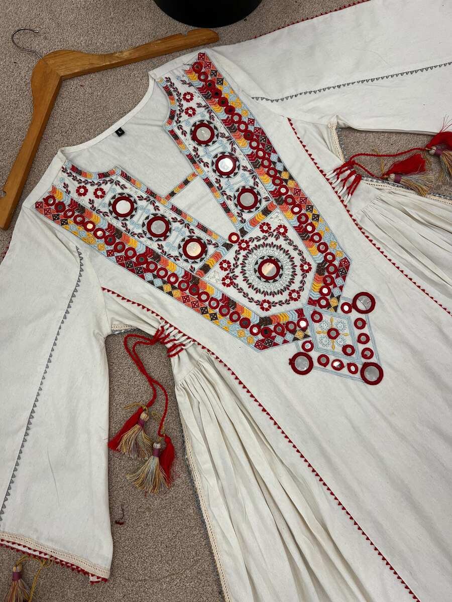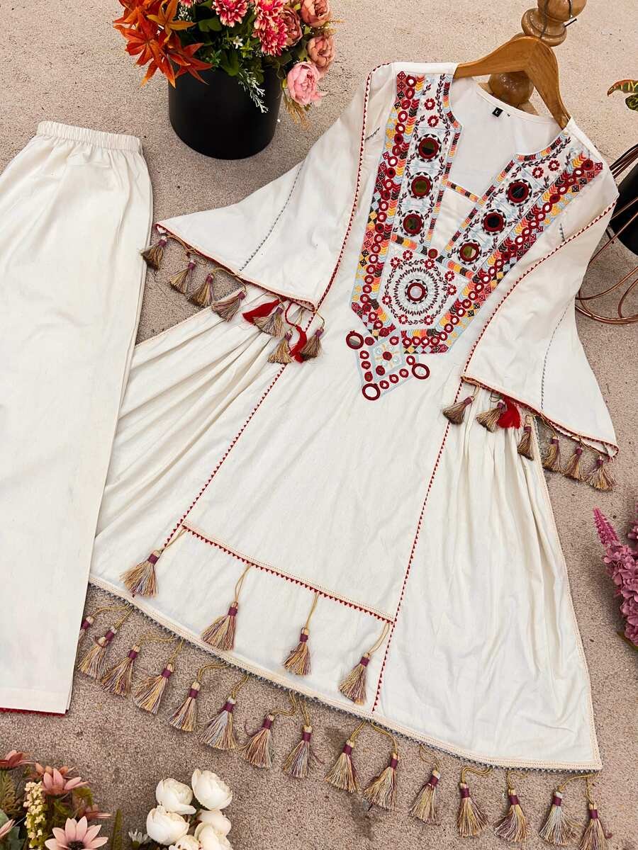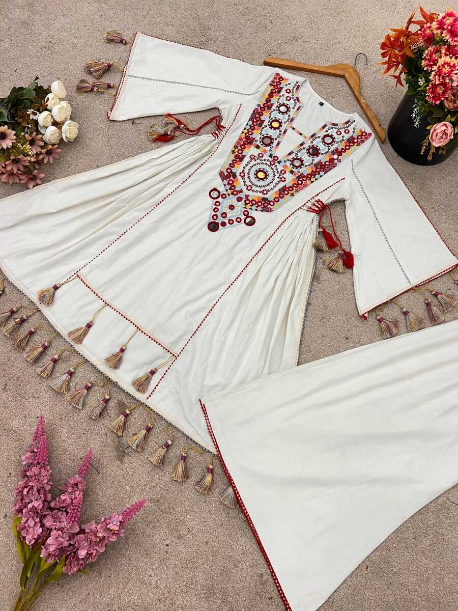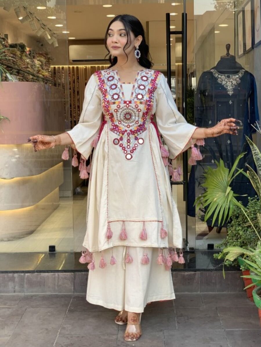 FANCY KHADI COTTON EMBROIDERY SEQUENCE WORK WITH REAL MIRROR WORK KURTI PALAZZO SET WHITE