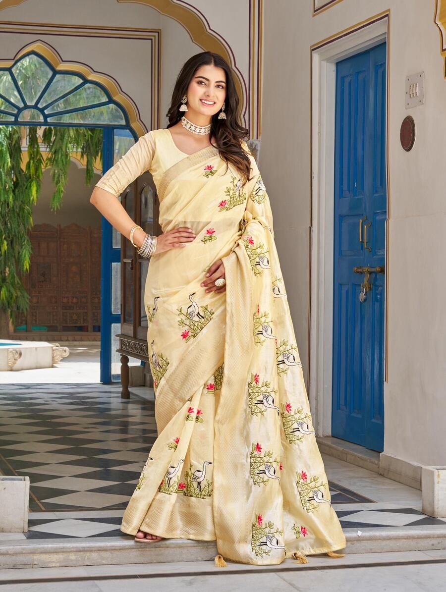 FANCY KOTA CRYSTLE JACQUARD BORDER WITH EMBROIDERY THREAD WORK SAREE WITH UNSTITCHED BLOUSE YELLOW