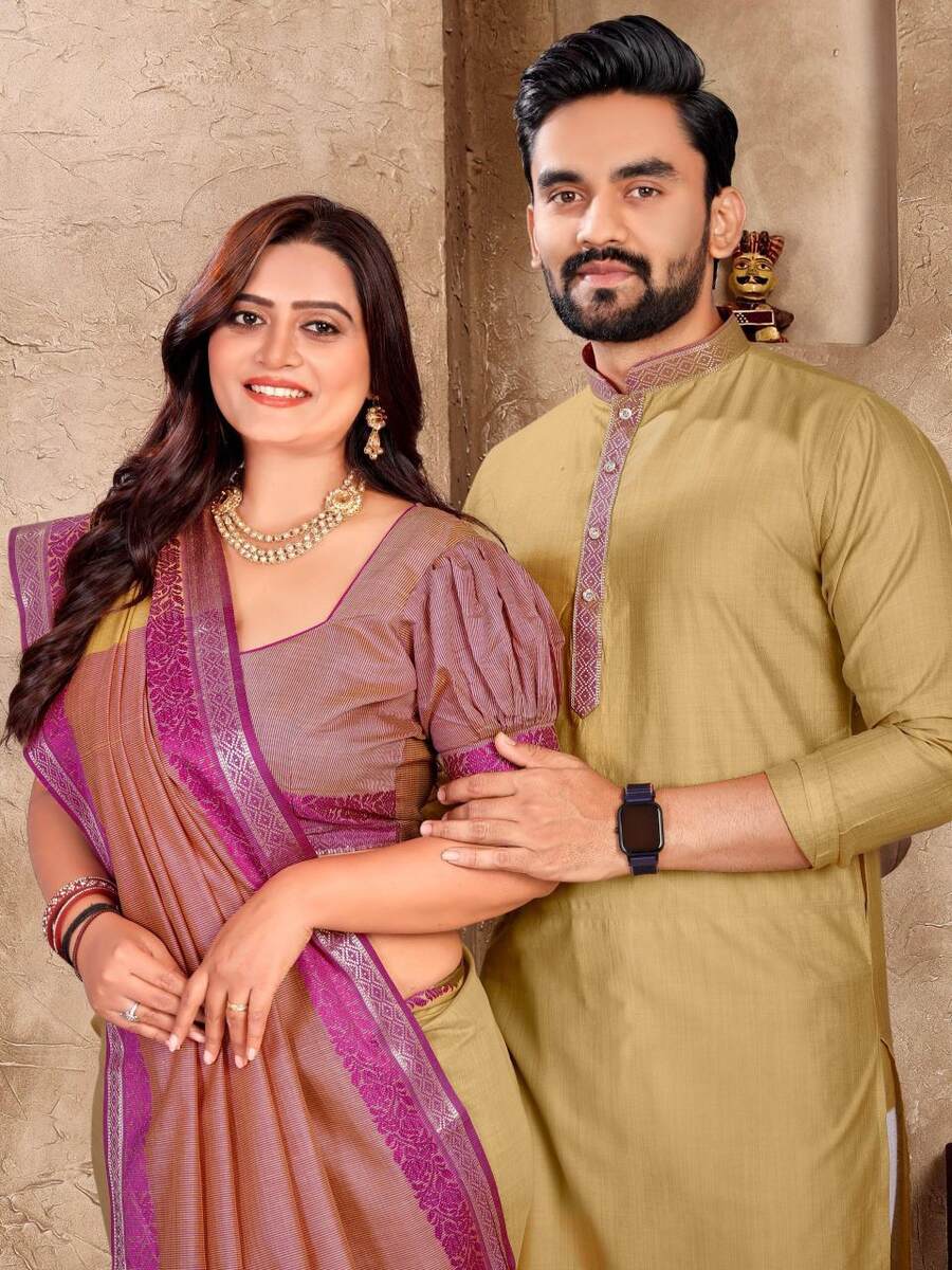 FANCY LINEN SILK JACQUARD PRINT MEN’S KURTA AND WOMEN’S SAREE WITH UNSTITCHED BLOUSE COUPLE COMBO CHIKU
