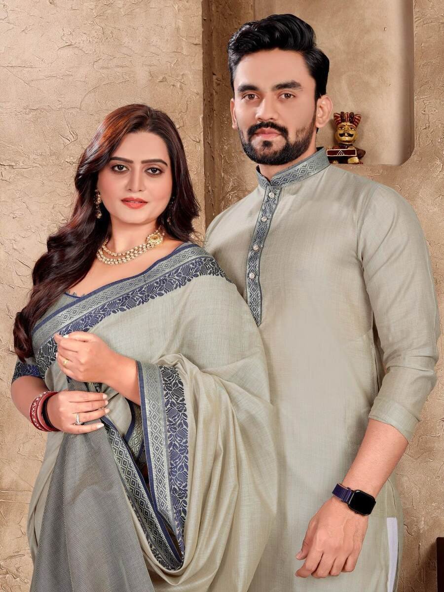 FANCY LINEN SILK JACQUARD PRINT MEN’S KURTA AND WOMEN’S SAREE WITH UNSTITCHED BLOUSE COUPLE COMBO GREY