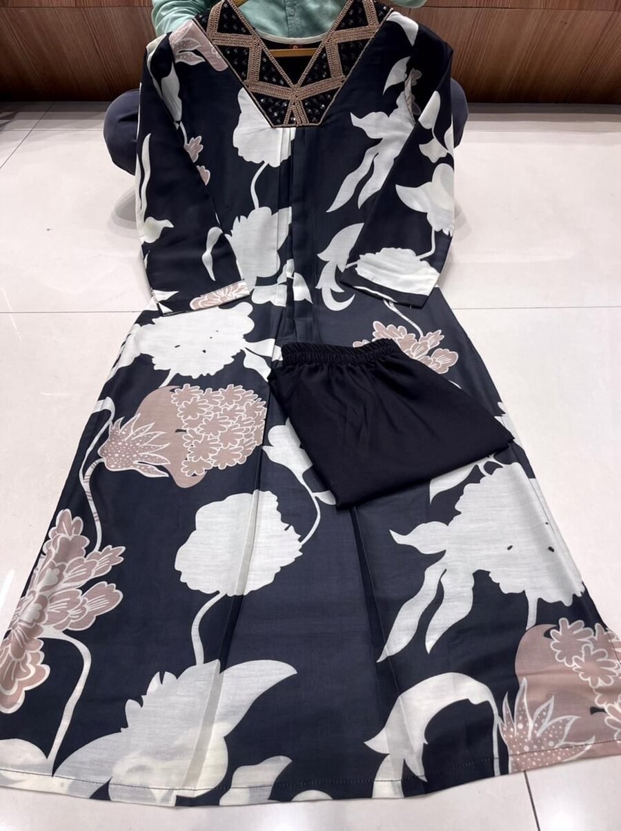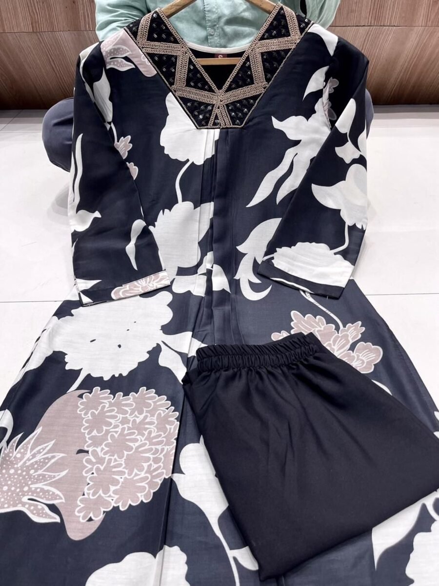 KURTI PENT SET :FABRIC :- MUSLIN WITH DIGITAL PRINT EMBROIDERY AND SEQUENCE WORKINNER :- HEAVY CREPEPANT :- HEAVY CREPEINCLUSIVE :- TOP-BOTTOM (2 PCS)SIZE :- S, M, L, XL, XXL, 3XL