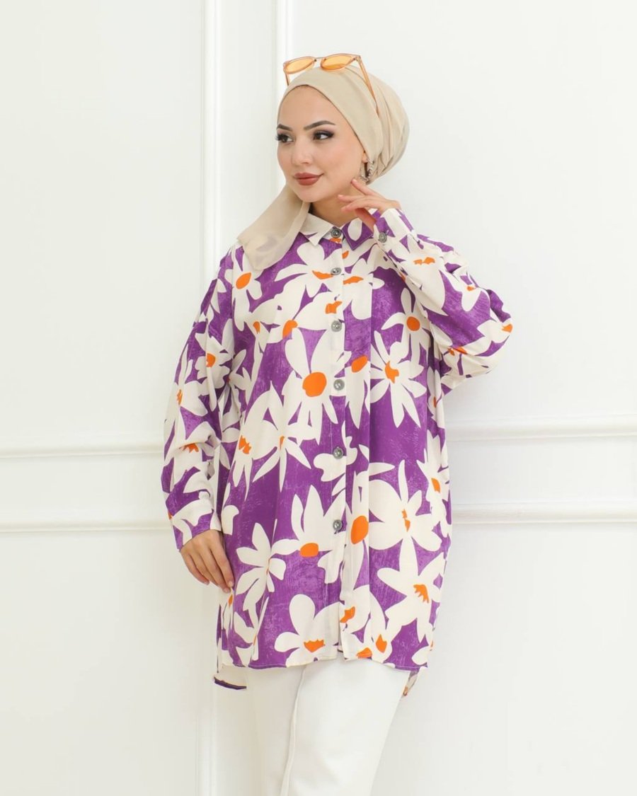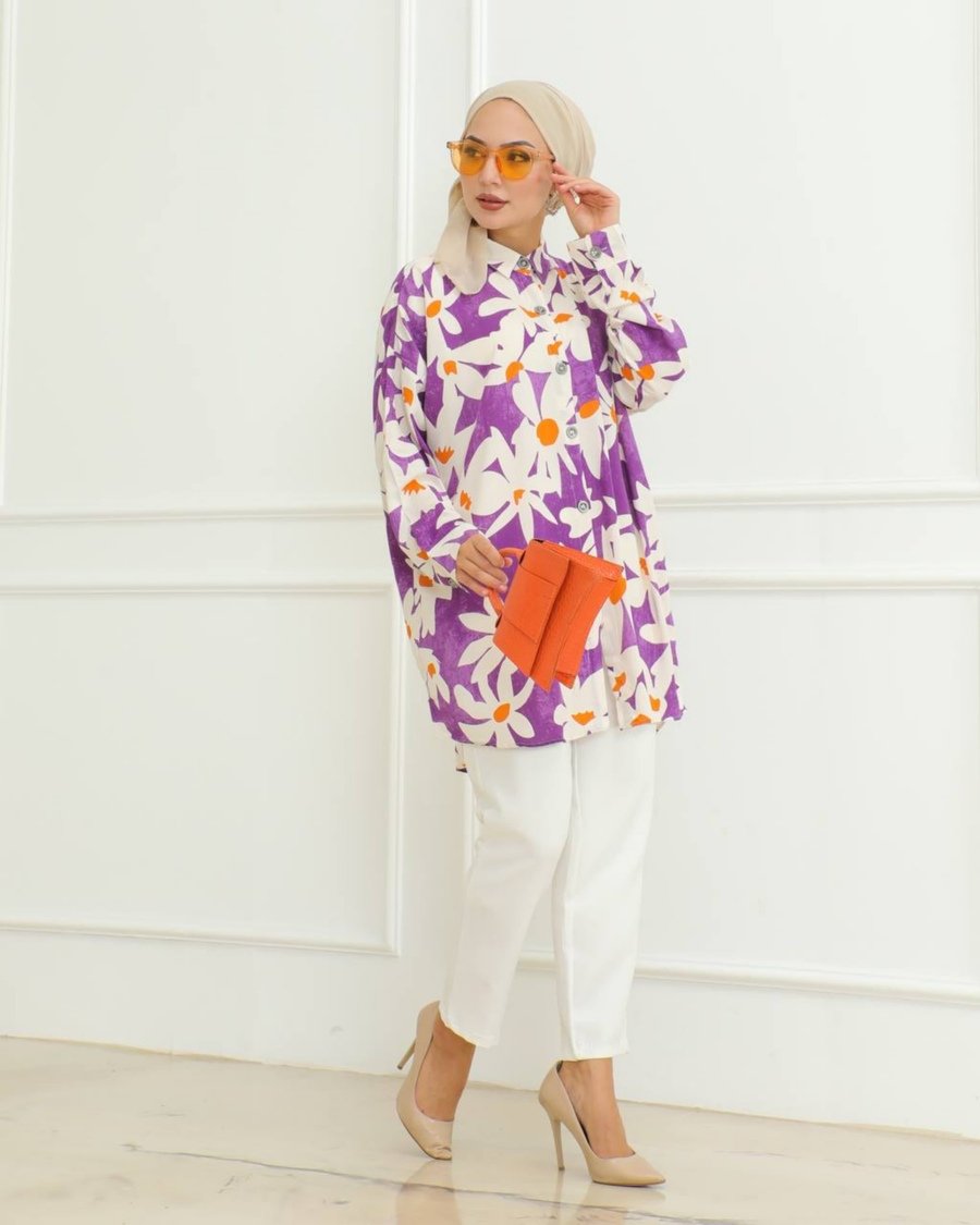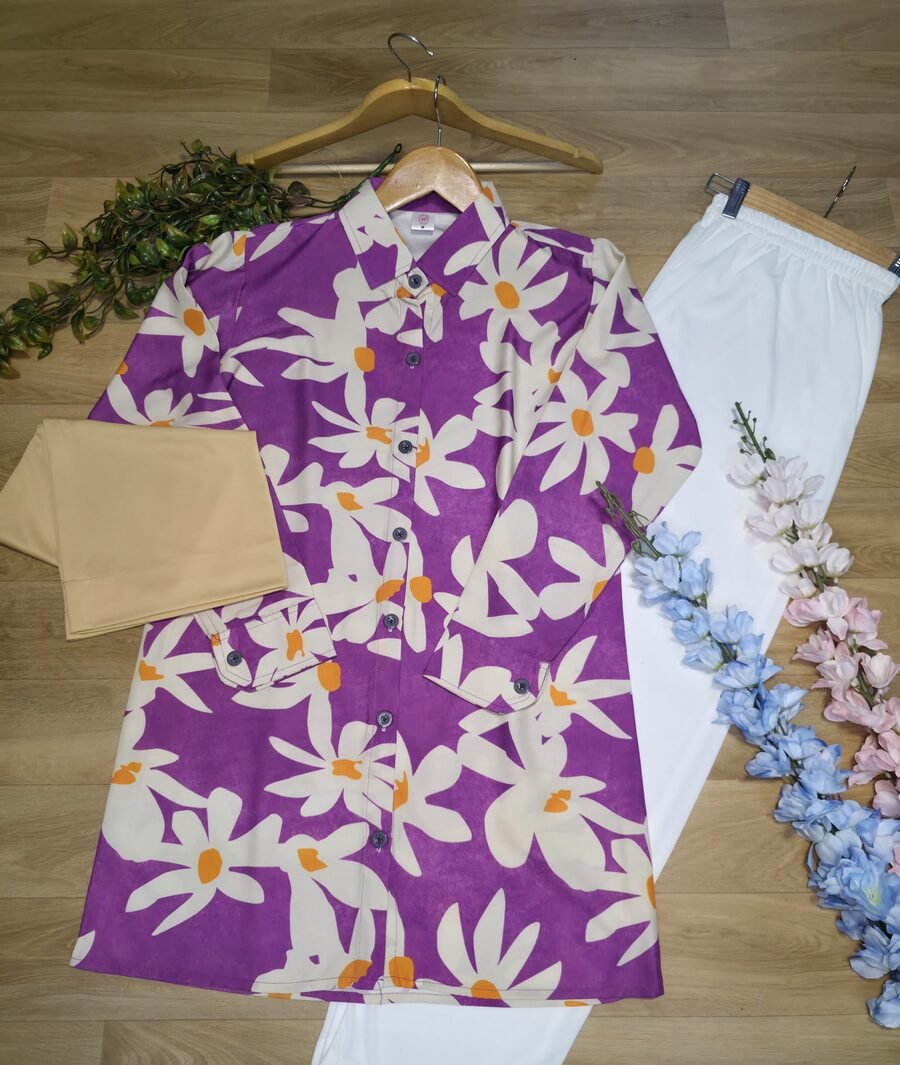 FANCY RAYON DIGITAL PRINTED TOP PENT SET WITH HIJAB PURPLE