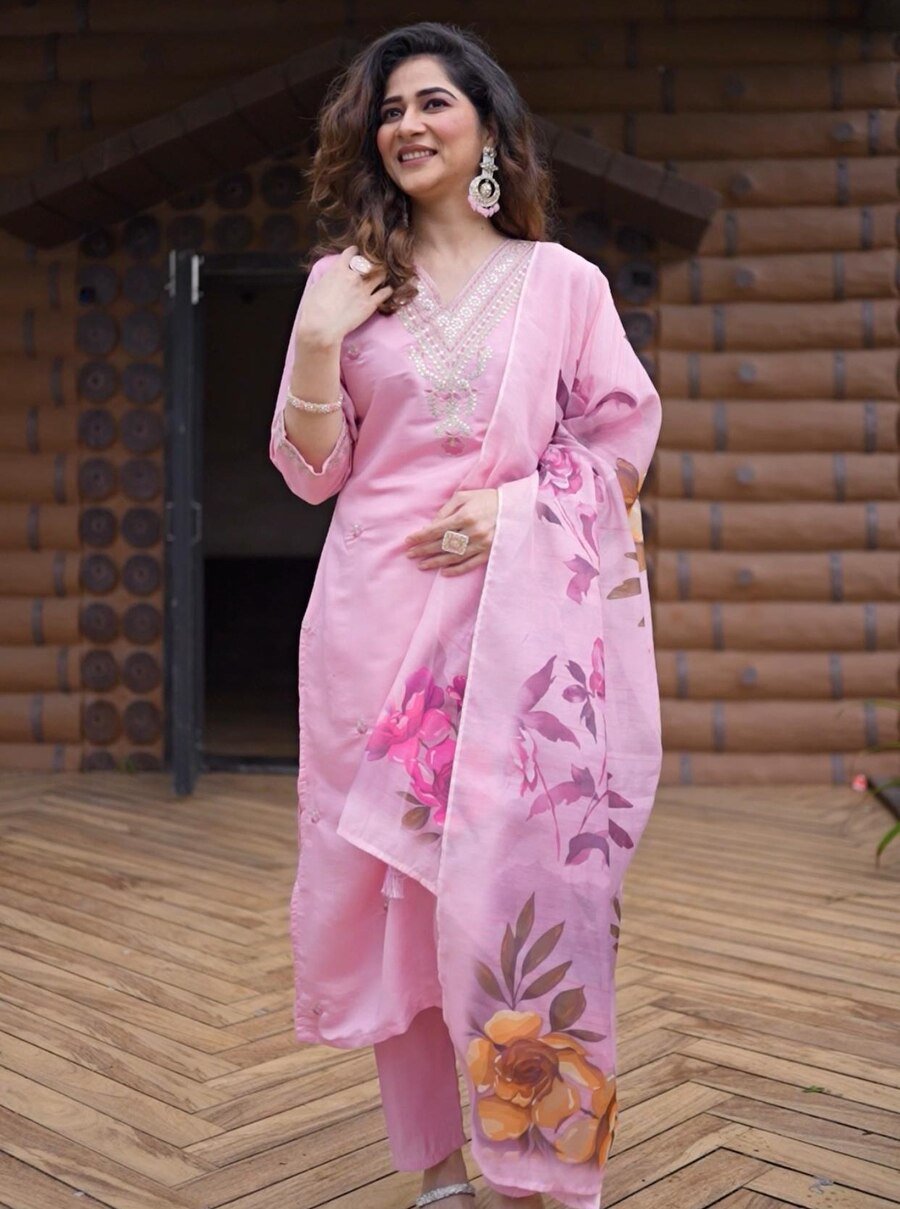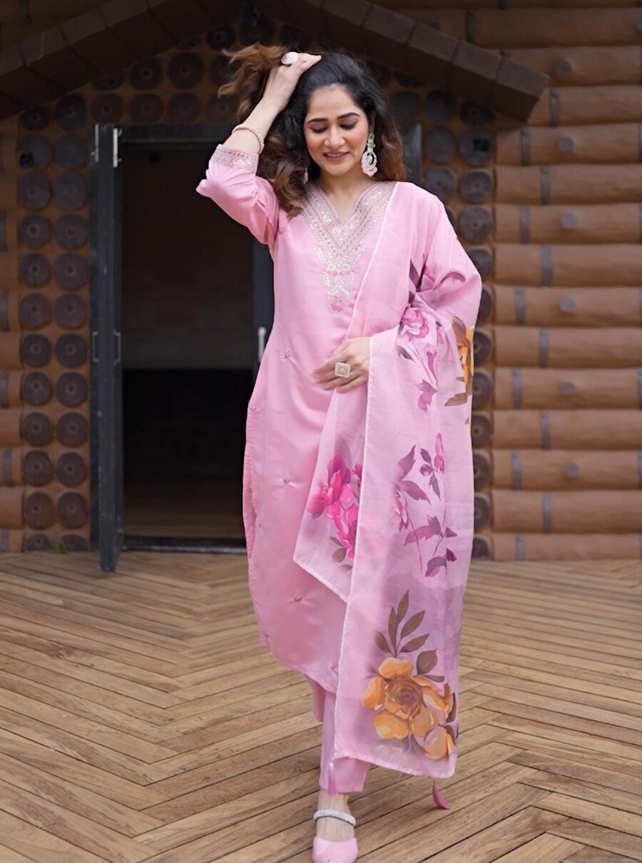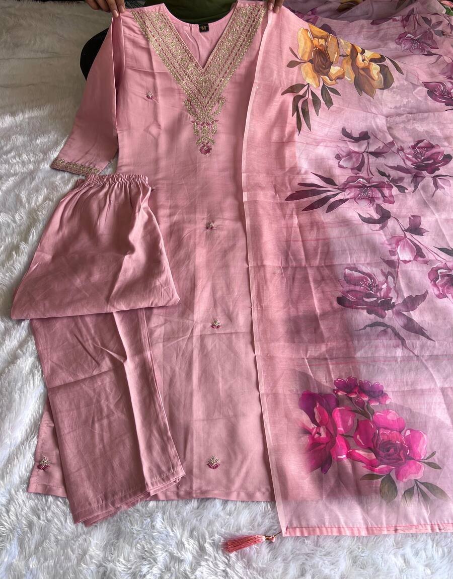 FANCY ROMAN SILK EMBROIDERY WITH SEQUENCE WORK TOP BOTTOM WITH DUPATTA BABY PINK