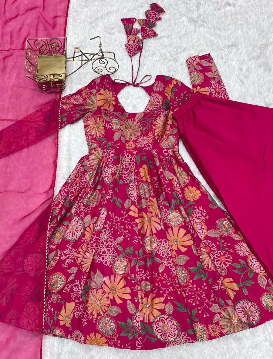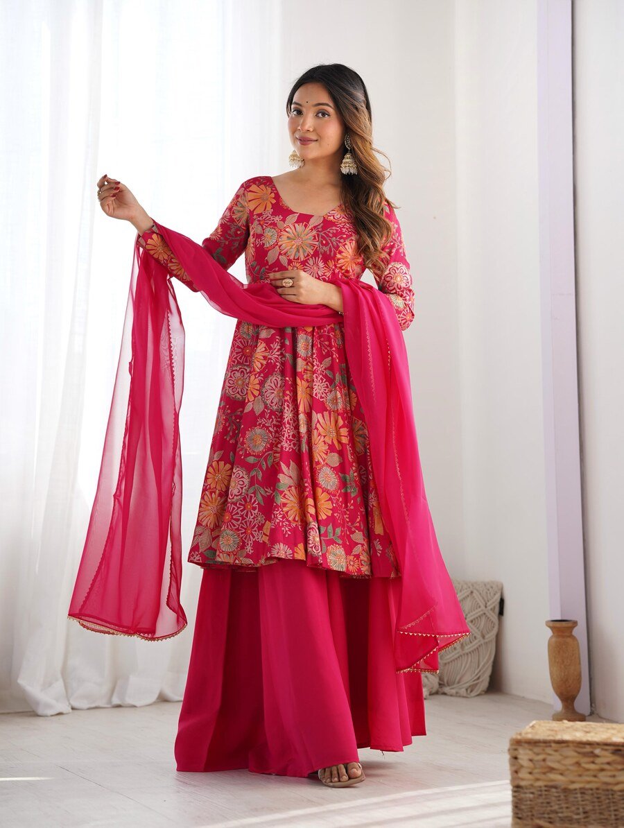 FANCY RROMAN SILK DISCHARGE PRINTING WORK KEDIYA STYLE TOP PALAZZO WITH DUPATTA RANI