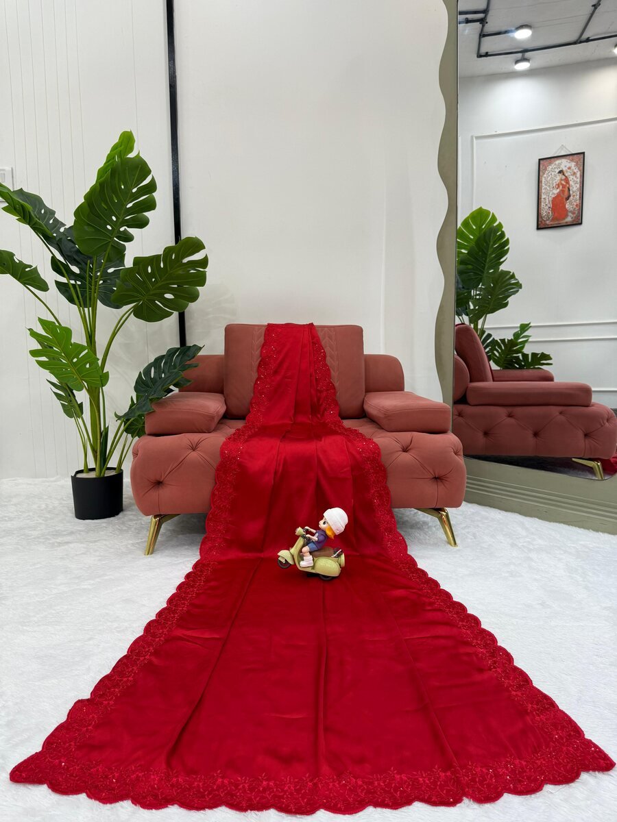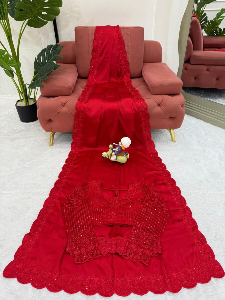 FANCY SATIN SILK THREAD WITH SEQUENCE WORK SAREE WITH UNSTITCHED BLOUSE AND WAIST BELT RED
