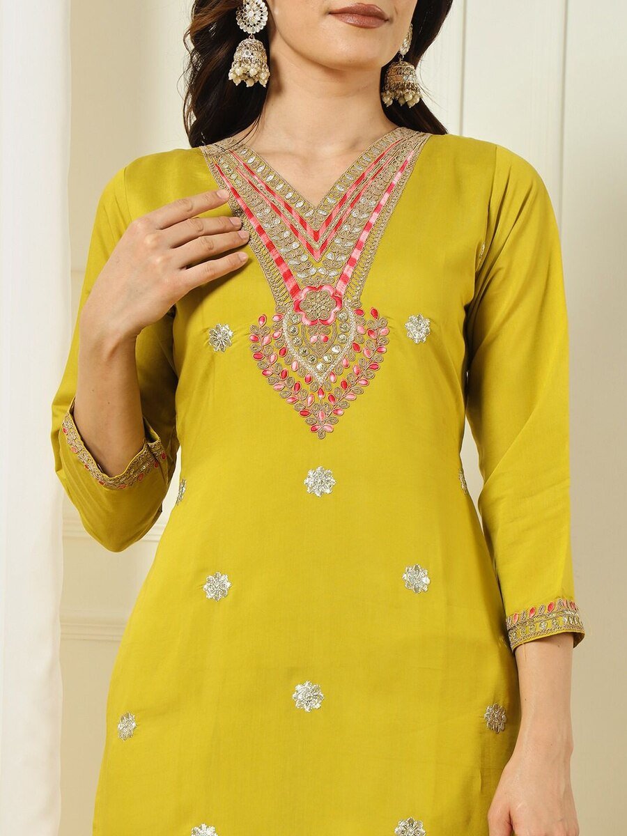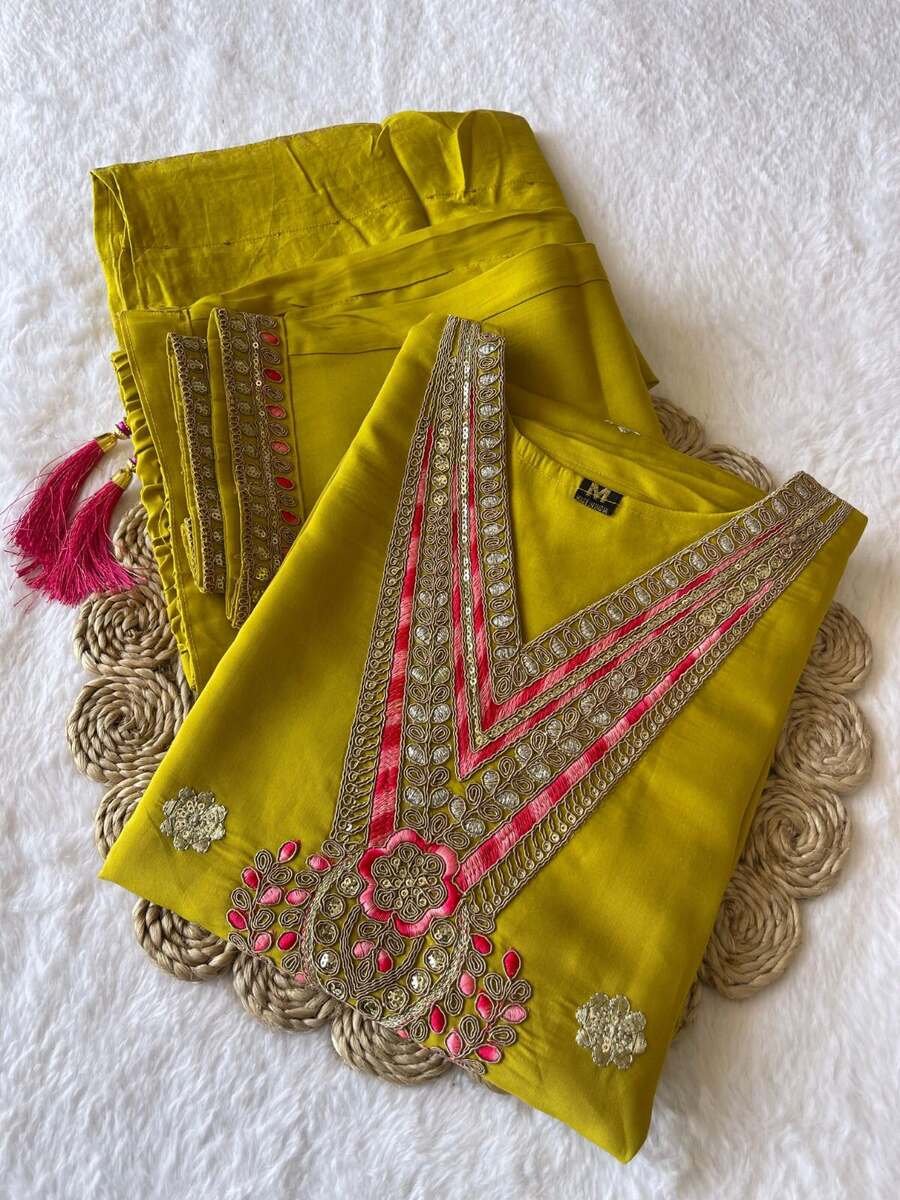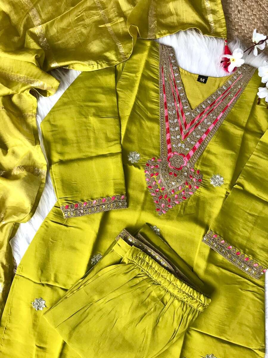 FANCY SILK EMBROIDERY WITH SEQUENCE WORK TOP BOTTOM WITH DUPATTA MEHNDI