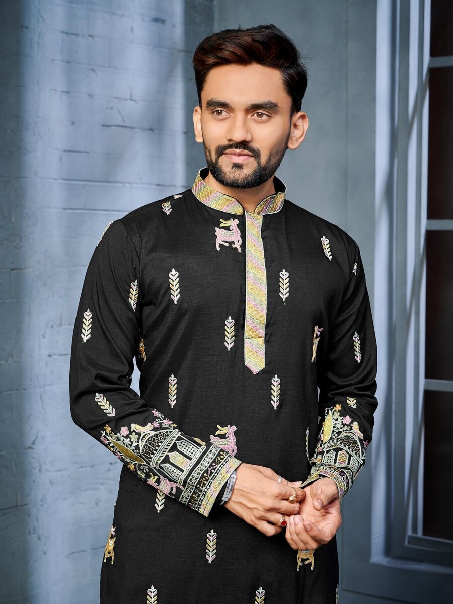 FANCY SOFT SILK MULTI THREAD EMBROIDERY WORK MEN’S KURTA PAYJAMA BLACK