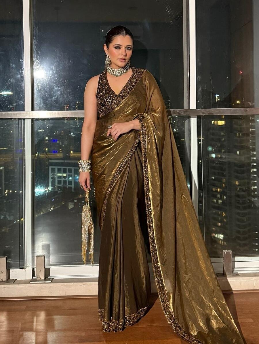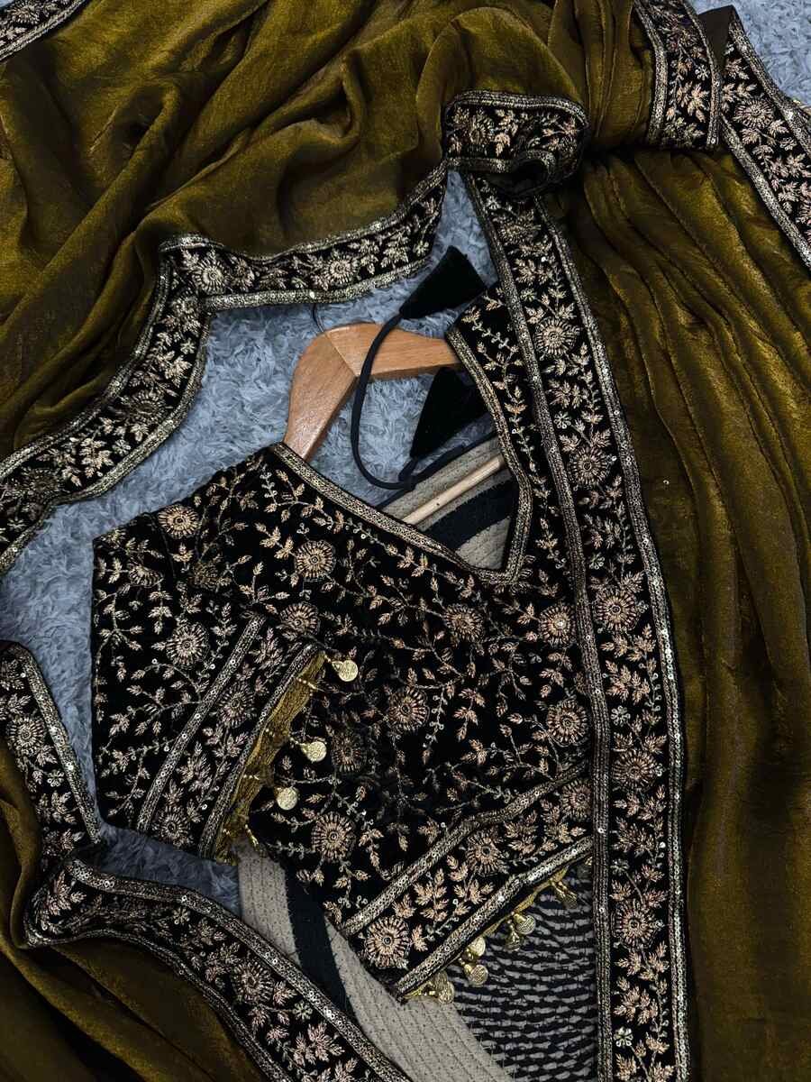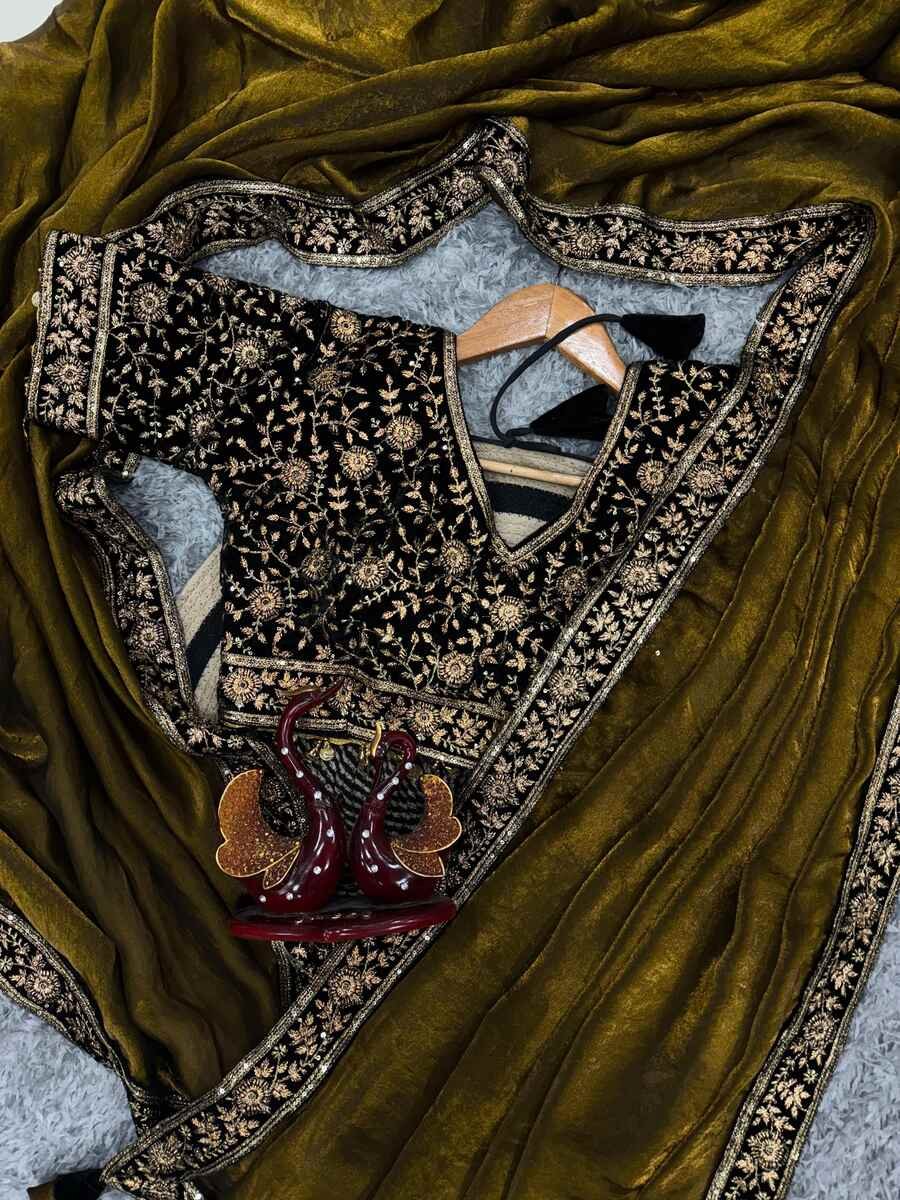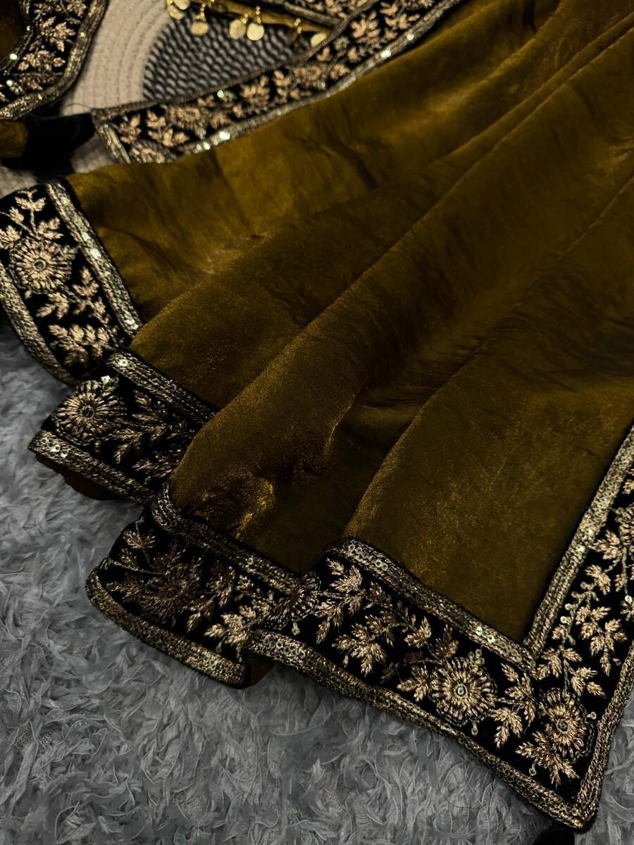 FANCY SPACE SILK SEQUENCE AND ZARI EMBROIDERY WORK LACE BORDER WITH FANCY LATKAN WORK SAREE WITH STITCHED BLOUSE MEHNDI
