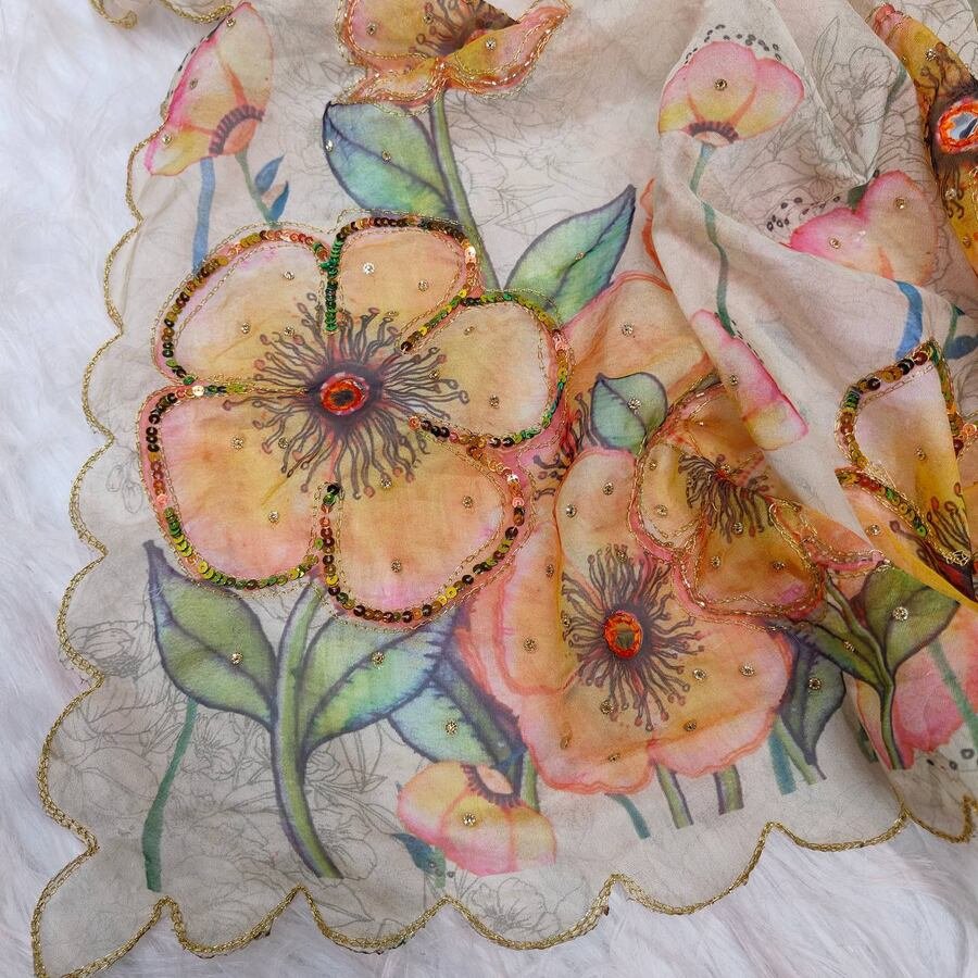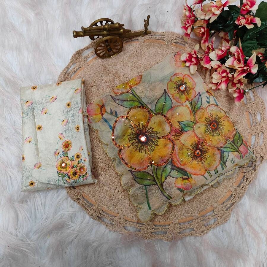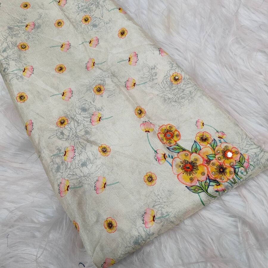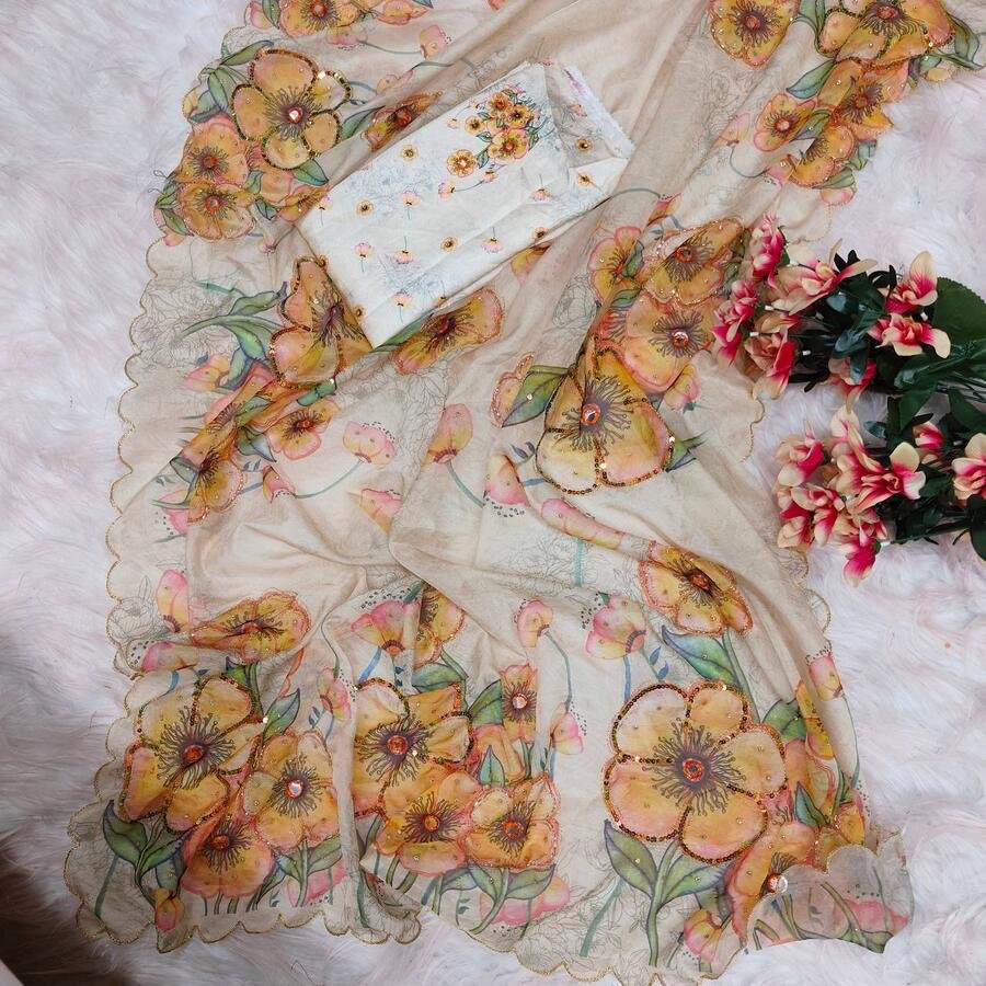 SAREE FABRIC :- TABBY PURE ORGANZA SILK WITH DIGITAL PRINTED SAREES WITH SEQUENCE AND EMBROIDERY HAND WORK BUTTA ALL OVER SAREES AND MATCHING ARC ON BORDER