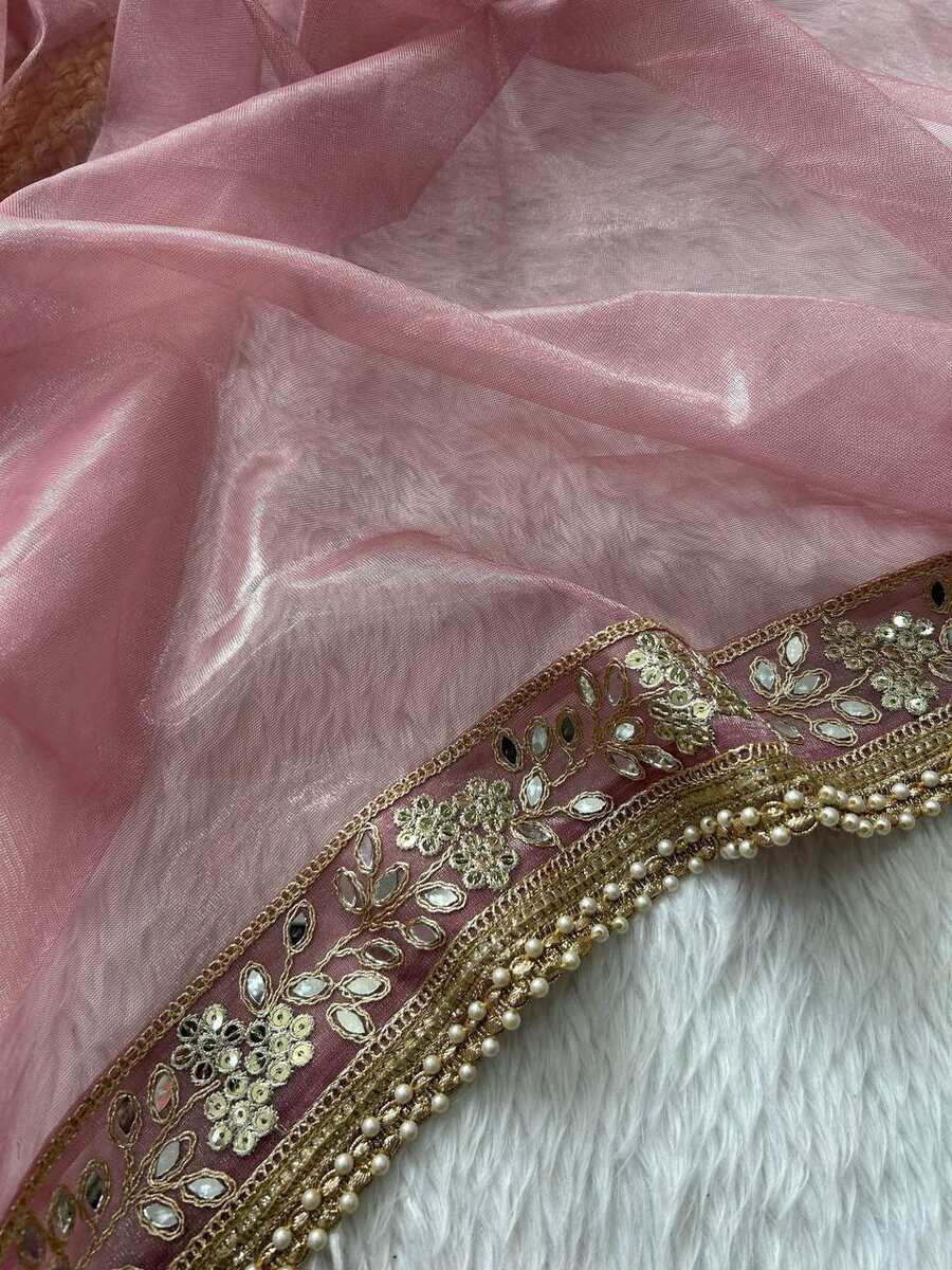 FANCY TISSUE SILK EMBROIDERY SEQUENCE MIRROR MOTI LACE BORDER WORK SAREE WITH UNSTITCHED BLOUSE BABY PINK