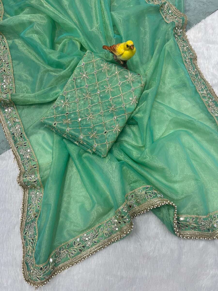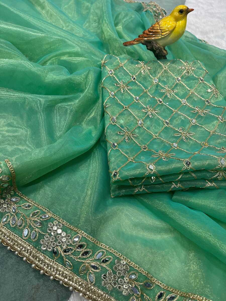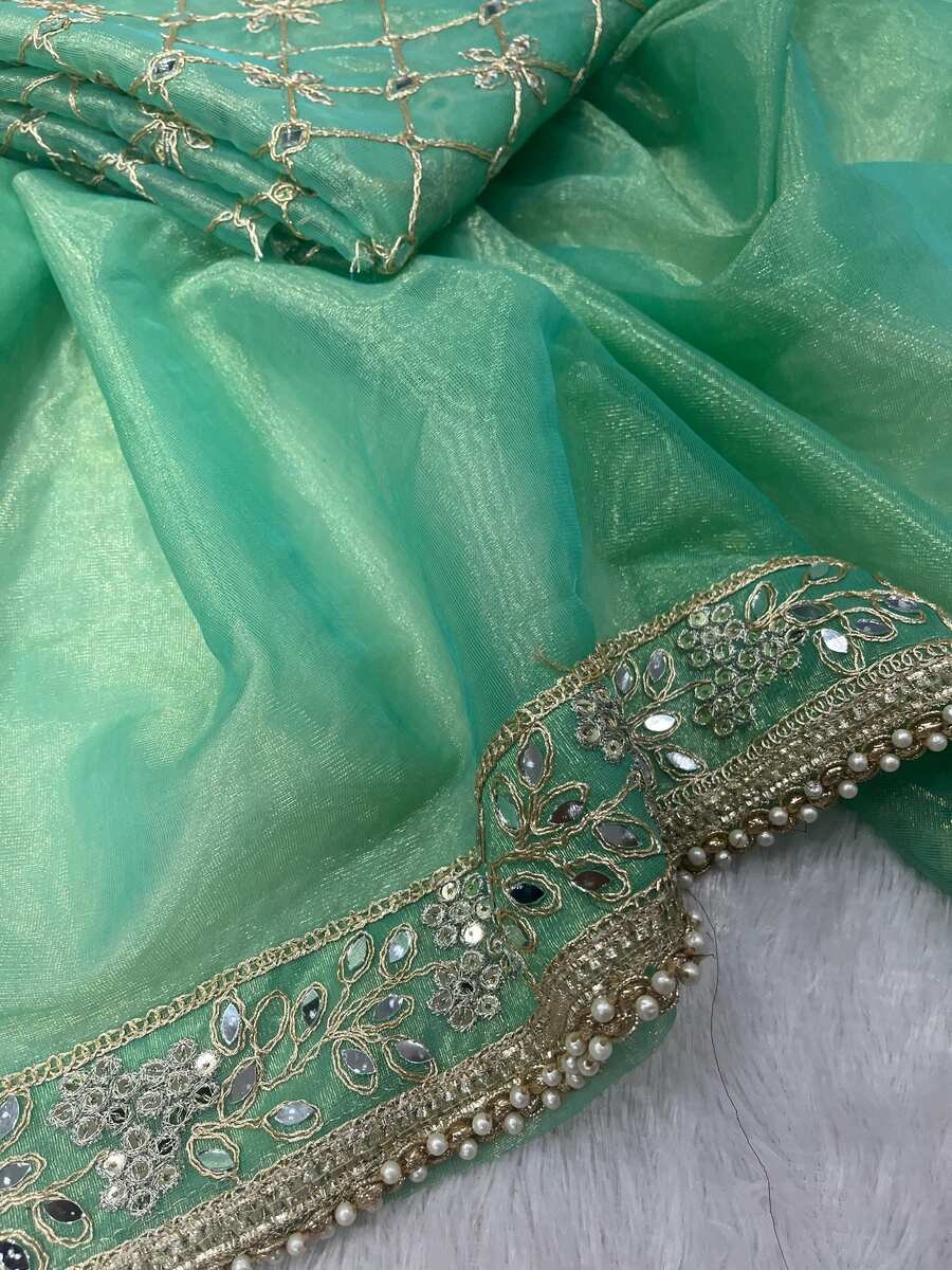 WORK : DESIGNER EMBROIDERY WORK OF SEQUENCE WITH ZARI DORI WORK WITH REAL MIRROR WORK AND ALSO ATTACHED FANCY LACE BORDER OF MOTI