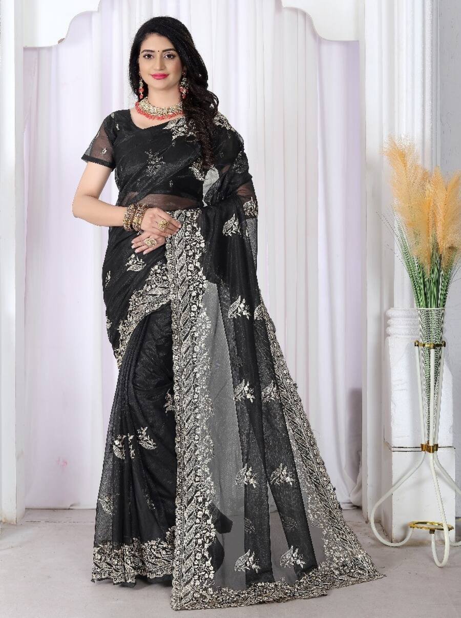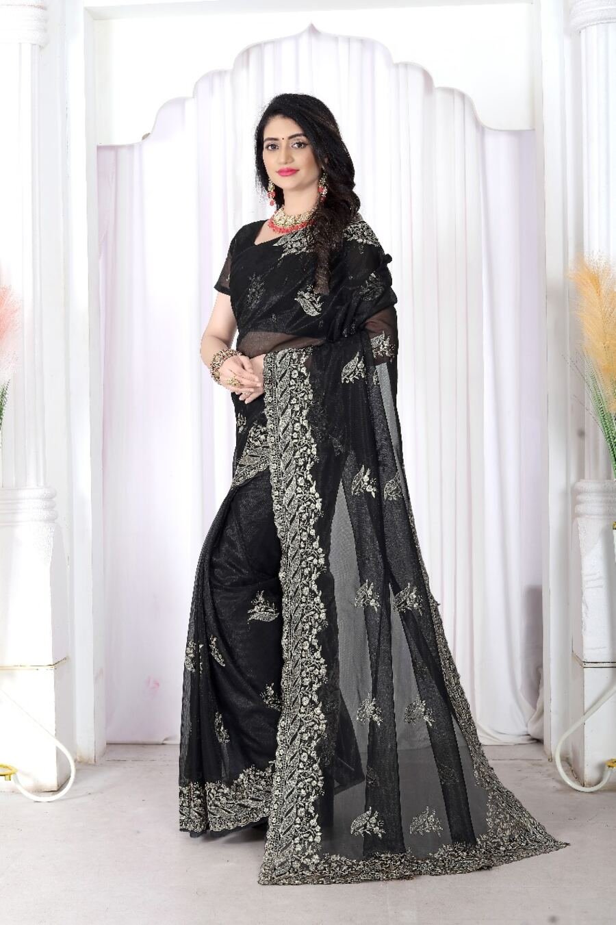 FANCY TWILL NET EMBROIDERY DIAMOND WORK SAREE WITH UNSTITCHED BLOUSE BLACK