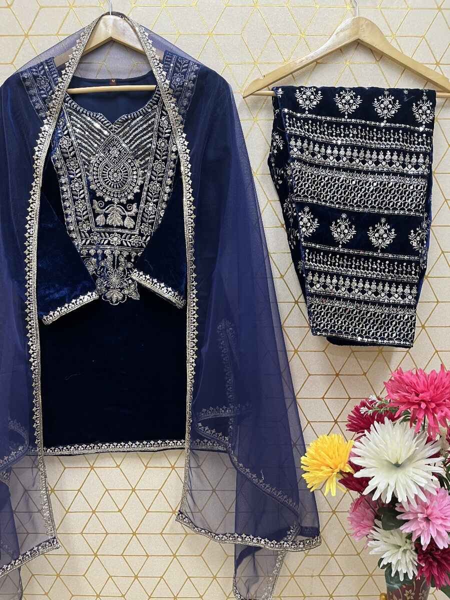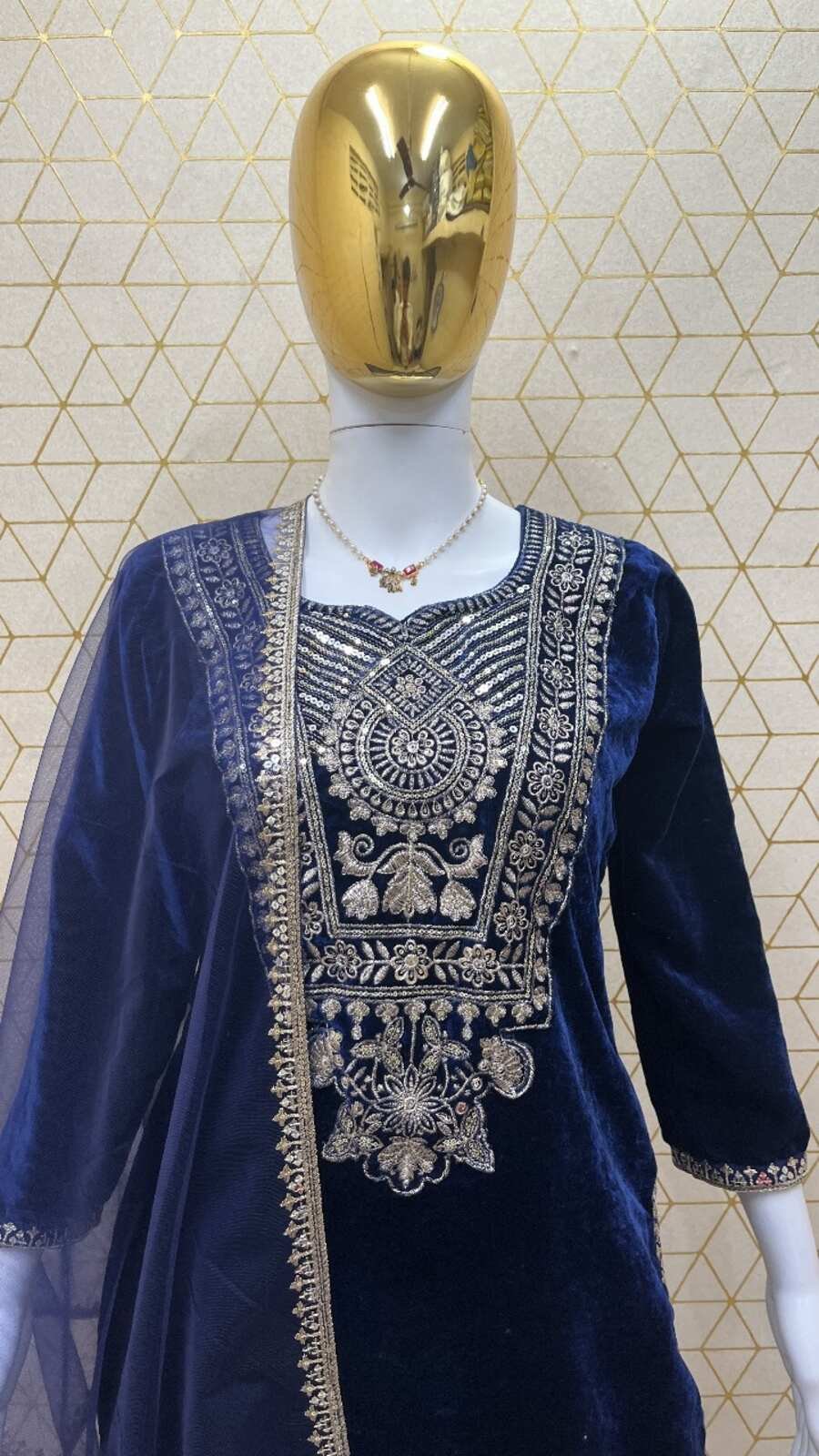 FANCY VISCOSE VELVET EMBROIDERY SEQUENCE WORK TOP BOTTOM WITH DUPATTA BLUE